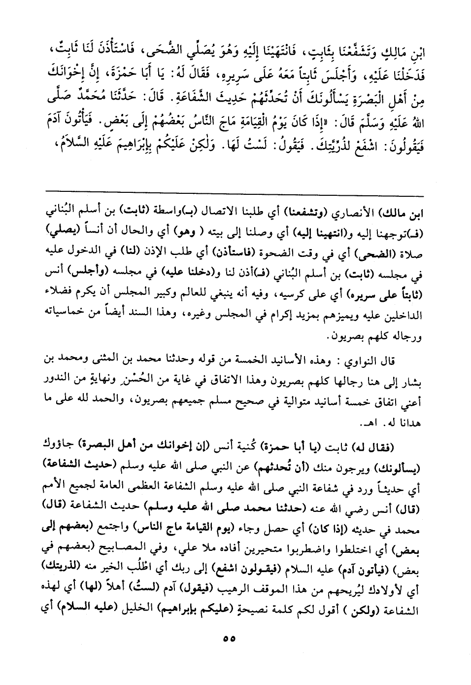 ابْنِ مَالِكٍ وَتَشَفَّعْنَا بِثَابِتٍ، فَانْتَهَينَا إِلَيهِ وَهُوَ يُصَلِّي الضُّحَى، فَاسْتَأذَنَ لَنَا ثَابِتٌ، فَدَخَلْنَا عَلَيهِ، وَأَجْلَسَ ثَابِتًا مَعَهُ عَلَى سَرِيرِهِ، فَقَال لَهُ: يَا أَبَا حَمْزَةَ، إِنَّ إِخْوَانَكَ مِنْ أَهْلِ الْبَصْرَةِ يَسأَلُونَكَ أَنْ تُحَدِّثَهُمْ حَدِيثَ الشَّفَاعَةِ. قَال: حَدَّثَنَا مُحَمَّدٌ صَلَّى اللهُ عَلَيهِ وَسَلَّمَ قَال: "إِذَا كَانَ يَوْمُ الْقِيَامَةِ مَاجَ النَّاسُ بَعْضُهُمْ إِلَى بَغضٍ. فَيَأْتُونَ آدَمَ فَيَقُولُونَ: اشْفَعْ لذُرِّيَّتِكَ. فَيَقُولُ: لَسْتُ لَهَا. وَلكِنْ عَلَيكُمْ بِإِبْرَاهِيمَ عَلَيهِ السَّلامُ،