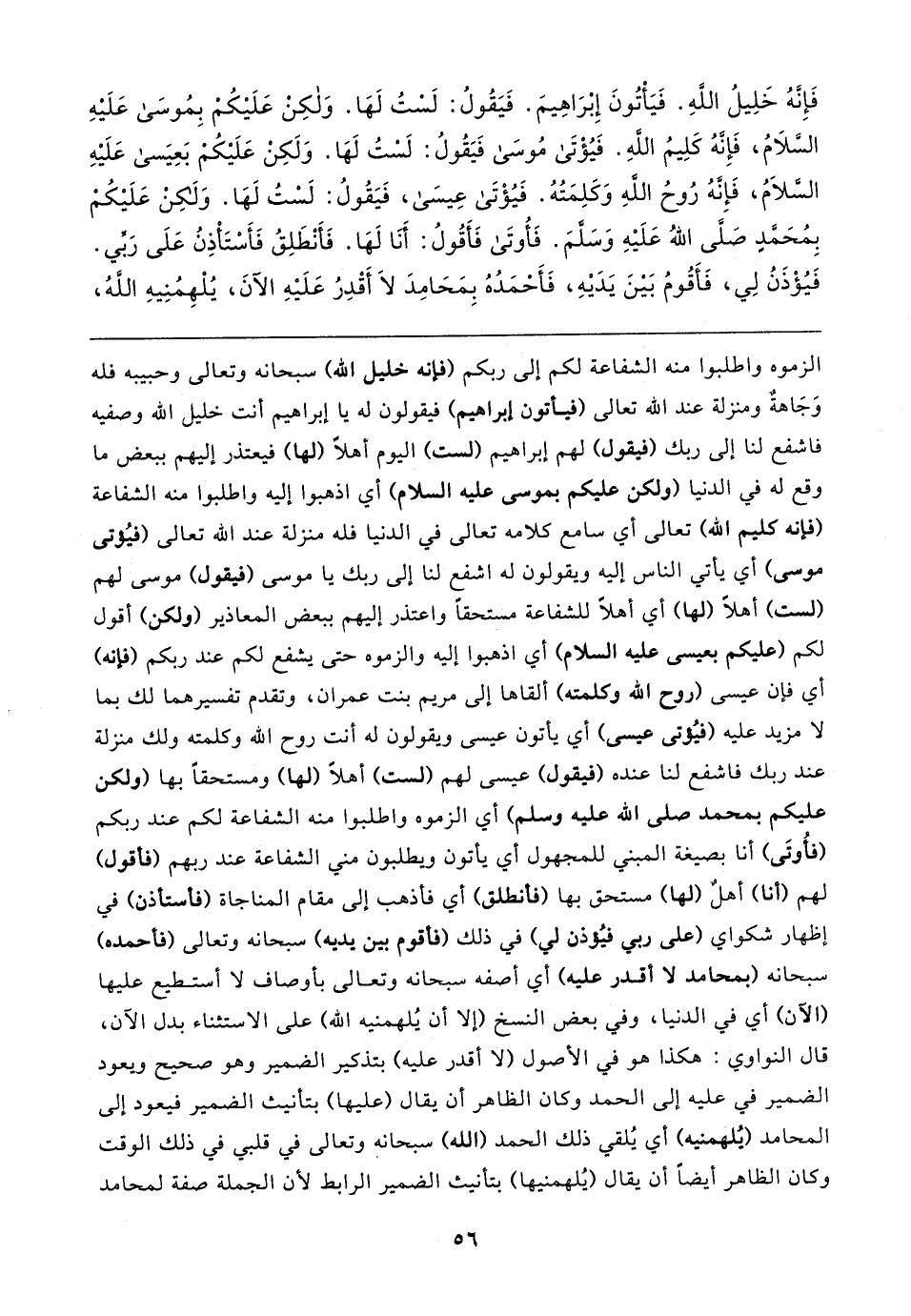فَإِنَّهُ خَلِيلُ اللهِ. فَيَأْتُونَ إِبْرَاهِيمَ. فَيَقُولُ: لَسْتُ لَهَا. وَلكِنْ عَلَيكُمْ بِمُوسَى عَلَيهِ السَّلامُ، فَإِنَّهُ كَلِيمُ اللهِ. فَيُؤْتَى مُوسَى فَيَقُولُ: لَسْتُ لَهَا. وَلَكِنْ عَلَيكُمْ بَعِيَسى عَلَيهِ السَّلامُ، فَإِنَّهُ رُوحُ اللهِ وَكَلِمَتُهُ. فَيُؤْتَى عِيسَى، فَيَقُولُ: لَسْتُ لَهَا. وَلَكنْ عَلَيكُمْ بِمُحَمَّدٍ صَلَّى اللهُ عَلَيهِ وَسَلَّمَ. فَأُوتَى فَأَقُولُ: أَنَا لَهَا. فَأَنْطَلِقُ فَأَسْتَأذِنُ عَلَى رَبِّي. فَيُؤْذَنُ لِي، فَأقُومُ بَينَ يَدَيهِ، فَأَحْمَدُهُ بِمَحَامِدَ لَا أَقْدِرُ عَلَيهِ الآنَ، يُلْهِمُنِيهِ اللهُ،
