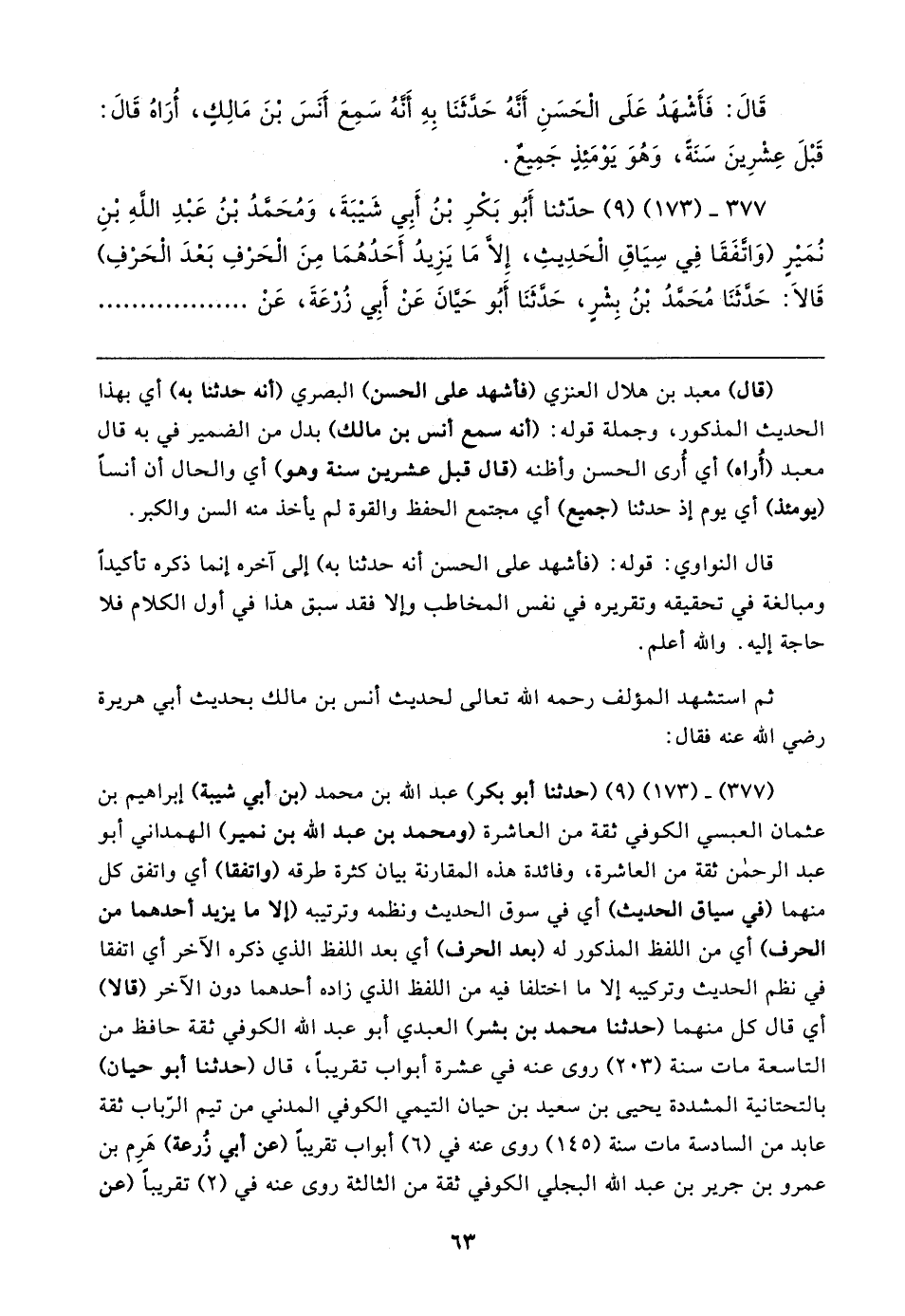 (٣٧٧) - (١٧٣) (٩) (حدثنا أبو بكر) عبد الله بن محمد (بن أبي شيبة) إبراهيم بن عثمان العبسي الكوفي ثقة من العاشرة (ومحمد بن عبد الله بن نمير) الهمداني أبو عبد الرحمن ثقة من العاشرة، وفائدة هذه المقارنة بيان كثرة طرقه (واتفقا) أي واتفق كل منهما (في سياق الحديث) أي في سوق الحديث ونظمه وترتيبه (إلا ما يزيد أحدهما من الحرف) أي من اللفظ المذكور له (بعد الحرت) أي بعد اللفظ الذي ذكره الآخر أي اتفقا في نظم الحديث وتركيبه إلا ما اختلفا فيه من اللفظ الذي زاده أحدهما دون الآخر (قالا) أي قال كل منهما (حدثنا محمد بن بشر) العبدي أبو عبد الله الكوفي ثقة حافظ من التاسعة مات سنة (٢٠٣) روى عنه في عشرة أبواب تقريبًا، قال (حدثنا أبو حيان) بالتحتانية المشددة يحيى بن سعيد بن حيان التيمي الكوفي المدني من تيم الرّباب ثقة عابد من السادسة مات سنة (١٤٥) روى عنه في (٦) أبواب تقريبًا (عن أبي زُرعة) هَرِم بن عمرو بن جرير بن عبد الله البجلي الكوفي ثقة من الثالثة روى عنه في (٢) تقريبًا (عن
