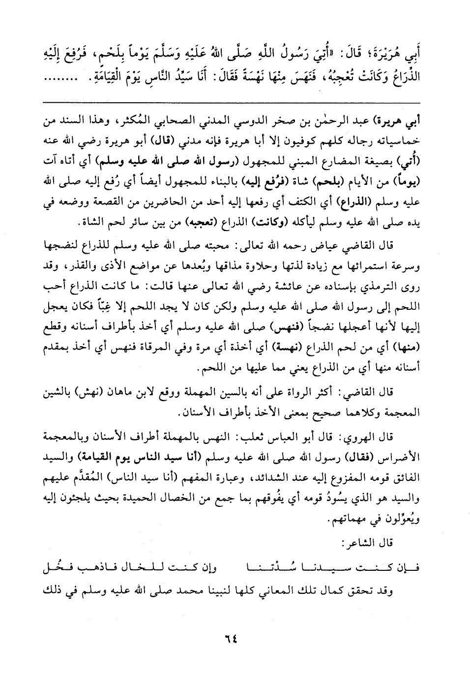أَبِي هُرَيرَةَ؛ قَال: "أُتِيَ رَسُولُ اللهِ صَلَّى اللهُ عَلَيهِ وَسَلَّمَ يَوْمًا بِلَحْمٍ، فَرُفِعَ إِلَيهِ الذِّرَاعُ وَكَانَتْ تُعْجِبُهُ، فَنَهَسَ مِنْهَا نَهْسَةً فَقَال: أَنَا سَيِّدُ النَّاسِ يَوْمَ الْقِيَامَةِ