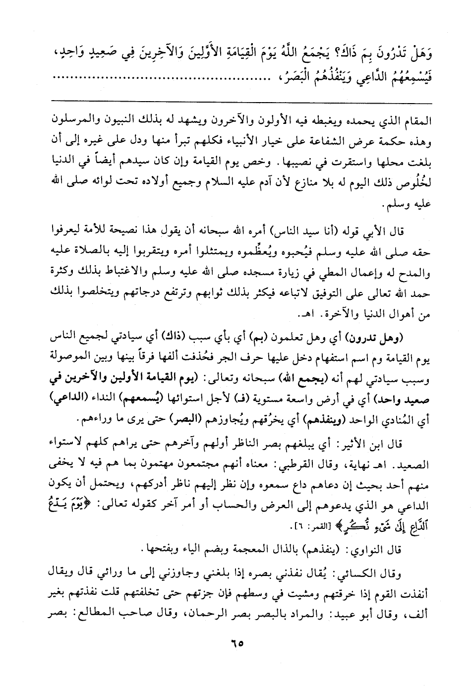 وَهَلْ تَدْرُونَ بِمَ ذَاكَ؟ يَجْمَعُ اللهُ يَوْمَ الْقِيَامَةِ الأوَّلِينَ وَالآخِرِينَ فِي صَعِيدٍ وَاحِدٍ، فَيُسْمِعُهُمُ الدَّاعِي ويَنْفُذُهُمُ الْبَصَرُ،
