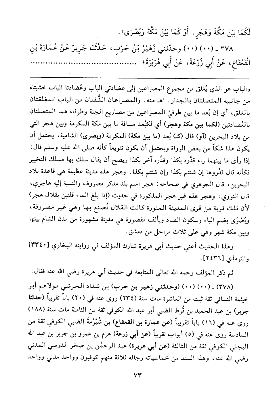 (٣٧٨) - (٠٠) (٠٠) (وحدثني زهير بن حرب) بن شداد الحرشي مولاهم أبو خيثمة النسائي ثقة ثبت من العاشرة مات سنة (٢٣٤) روى عنه في (٢٠) بابًا تقريبًا (حدثنا جرير) بن عبد الحميد بن قُرط الضبي أبو عبد الله الكوفي ثقة من الثامنة مات سنة (١٨٨) روى عنه في (١٦) بابًا تقريبًا (عن عمارة بن القعقاع) بن شُبْرُمةَ الضبي الكوفي ثقة من السادسة روى عنه في (٥) أبواب تقريبًا (عن أبي زرعة) هرم بن عمرو بن جرير بن عبد الله البجلي الكوفي ثقة من الثالثة (عن أبي هريرة) عبد الرحمن بن صخر الدوسي المدني رضي الله عنه، وهذا السند من خماسياته رجاله ثلاثة منهم كوفيون وواحد مدني وواحد
