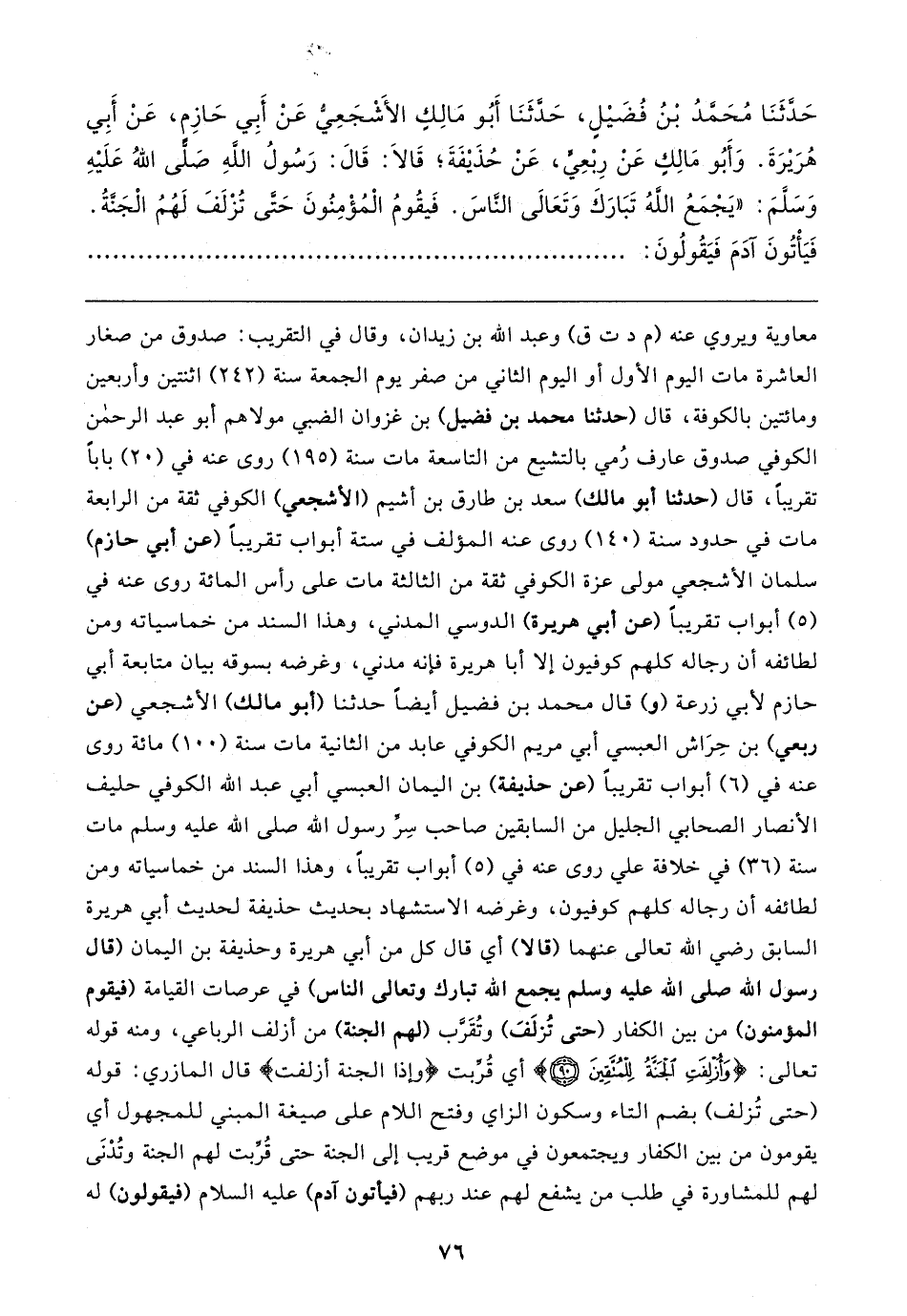 حَدَّثَنَا مُحَمَّدُ بْنُ فُضَيلٍ، حَدَّثَنَا أَبُو مَالِكٍ الأَشْجَعِيُّ عَنْ أَبِي حَازِمٍ، عَنْ أَبِي هُرَيرَةَ. وَأَبُو مَالِكٍ عَنْ رِبْعِيٍّ، عَنْ حُذَيفَةَ؛ قَالا: قَال: رَسُولُ اللهِ صَلَّى اللهُ عَلَيهِ وَسَلَّمَ: "يَجْمَعُ اللهُ تَبَارَكَ وَتَعَالى النَّاسَ. فَيقُومُ الْمُؤْمِنُونَ حَتَّى تُزْلَفَ لَهُمُ الْجَنَّةُ. فَيَأْتُونَ آدَمَ فَيَقُولُونَ: