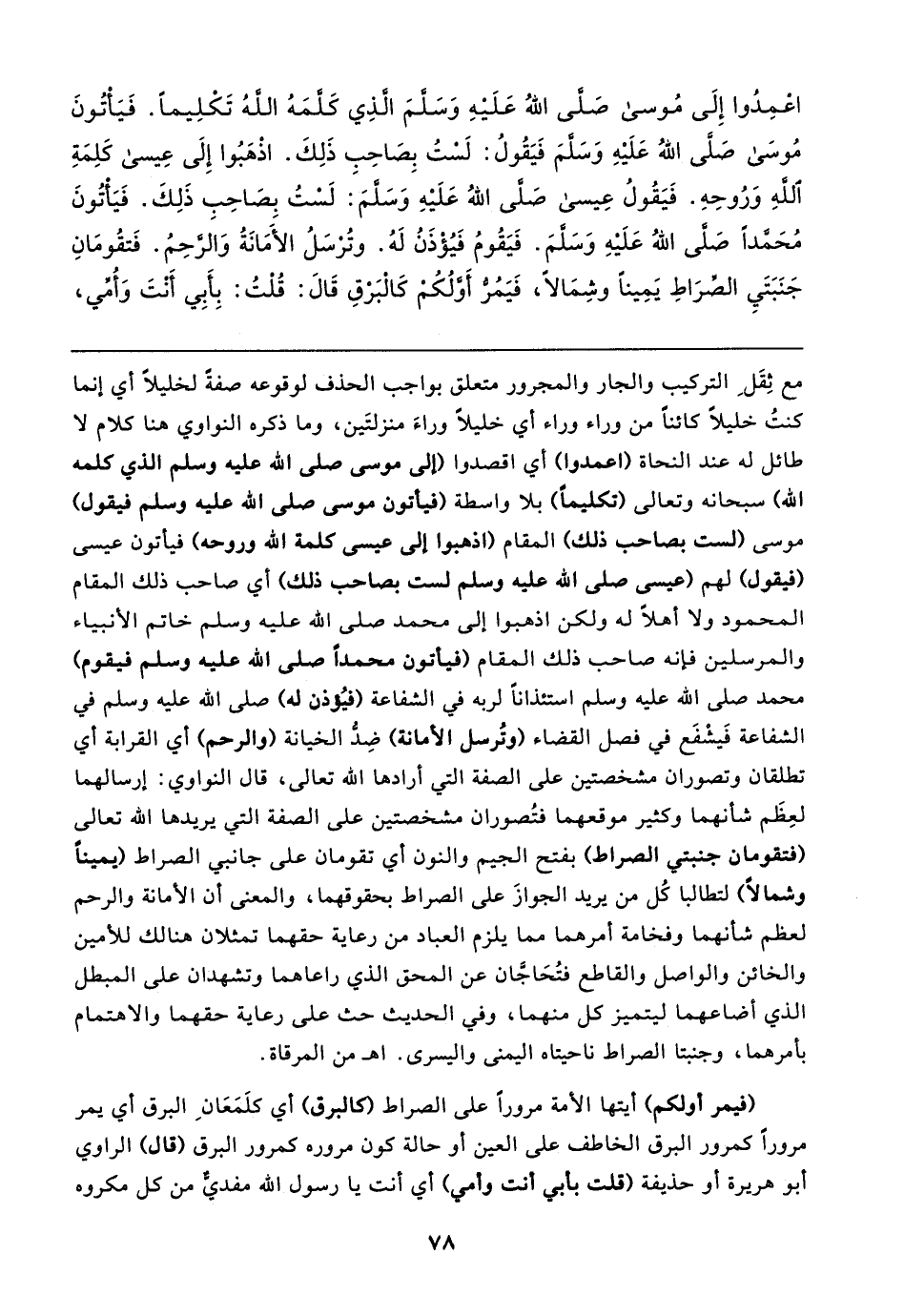 اعْمِدُوا إِلَى مُوسى صَلَّى اللهُ عَلَيهِ وَسَلَّمَ الَّذِي كَلَّمَهُ اللهُ تَكْلِيمًا. فَيَأْتُونَ مُوسَى صَلَّى اللهُ عَلَيهِ وَسَلَّمَ فَيَقُولُ: لَسْتُ بِصَاحِبِ ذَلِكَ. اذْهَبُوا إِلَى عِيسى كَلِمَةِ اللهِ وَرُوحِهِ. فَيَقُولُ عِيسى صَلَّى اللهُ عَلَيهِ وَسَلَّمَ: لَسْتُ بِصَاحِبِ ذَلِكَ. فَيَأْتُونَ مُحَمَّدًا صَلَّى اللهُ عَلَيهِ وَسَلَّمَ. فَيَقُومُ فَيُؤذَنُ لَهُ. وتُرْسَلُ الأَمَانَةُ وَالرَّحِمُ. فَتقُومَانِ جَنَبَتَيِ الصِّرَاطِ يَمِينًا وشِمَالًا، فَيَمُرُّ أَوَّلُكُمْ كَالْبَرْقِ قَال: قُلْتُ: بِأَبِي أَنْتَ وَأُمِّي،