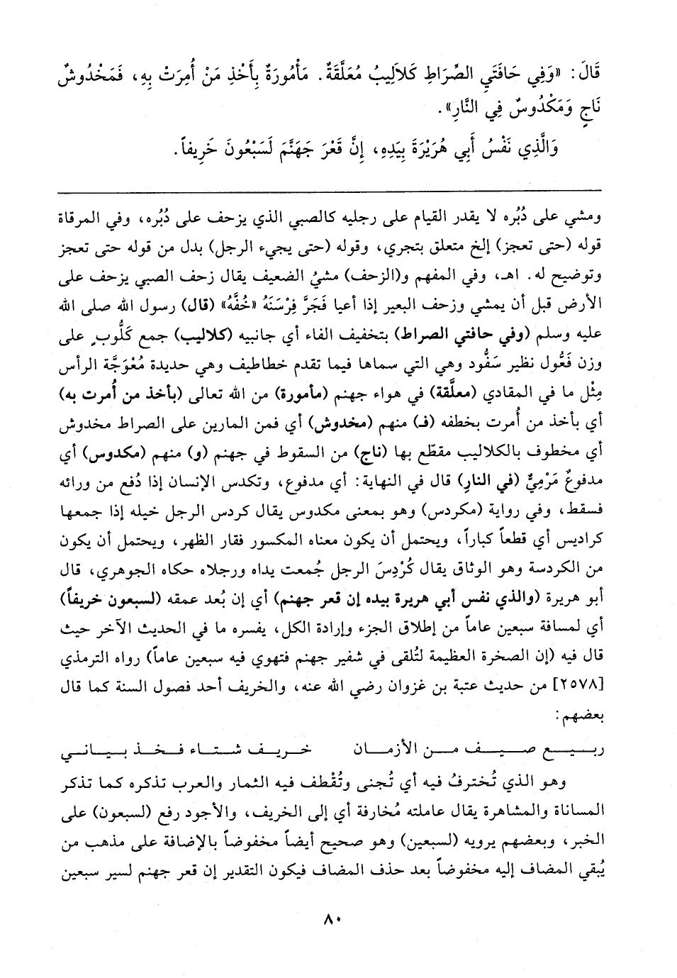 ومشي على دُبُره لا يقدر القيام على رجليه كالصبي الذي يزحف على دُبُره، وفي المرقاة قوله (حتى تعجز) إلخ متعلق بتجري، وقوله (حتى يجيء الرجل) بدل من قوله حتى تعجز وتوضيح له. اهـ، وفي المفهم و (الزحف) مشيُ الضعيف يقال زحف الصبي يزحف على الأرض قبل أن يمشي وزحف البعير إذا أعيا فَجَرَّ فِرْسَنَهُ "خُفَّهُ" (قال) رسول الله صلى الله عليه وسلم (وفي حافتي الصراط) بتخفيف الفاء أي جانبيه (كلاليب) جمع كَلُّوبٍ على وزن فَعُّول نظير سَفُّود وهي التي سماها فيما تقدم خطاطيف وهي حديدة مُعْوَجَّة الرأس مِثْل ما في المقادي (معلَّقة) في هواء جهنم (مأمورة) من الله تعالى (بأخذ من أُمرت به) أي بأخذ من أُمرت بخطفه (فـ) منهم (مخدوش) أي فمن المارين على الصراط مخدوش أي مخطوف بالكلاليب مقطّع بها (ناج) من السقوط في جهنم (و) منهم (مكدوس) أي مدفوعٌ مَرْمِيٌّ (في النارِ) قال في النهاية: أي مدفوع، وتكدس الإنسان إذا دُفع من ورائه فسقط، وفي رواية (مكردس) وهو بمعنى مكدوس يقال كردس الرجل خيله إذا جمعها كراديس أي قطعًا كبارًا، ويحتمل أن يكون معناه المكسور فقار الظهر، ويحتمل أن يكون من الكردسة وهو الوثاق يقال كُرْدِسَ الرجل جُمعت يداه ورجلاه حكاه الجوهري، قال أبو هريرة (والذي نفس أبي هريرة بيده إن قعر جهنم) أي إن بُعد عمقه (لسبعون خريفًا) أي لمسافة سبعين عامًا من إطلاق الجزء وإرادة الكل، يفسره ما في الحديث الآخر حيث قال فيه (إن الصخرة العظيمة لتُلقى في شفير جهنم فتهوي فيه سبعين عامًا) رواه الترمذي [٢٥٧٨] من حديث عتبة بن غزوان رضي الله عنه، والخريف أحد فصول السنة كما قال بعضهم: