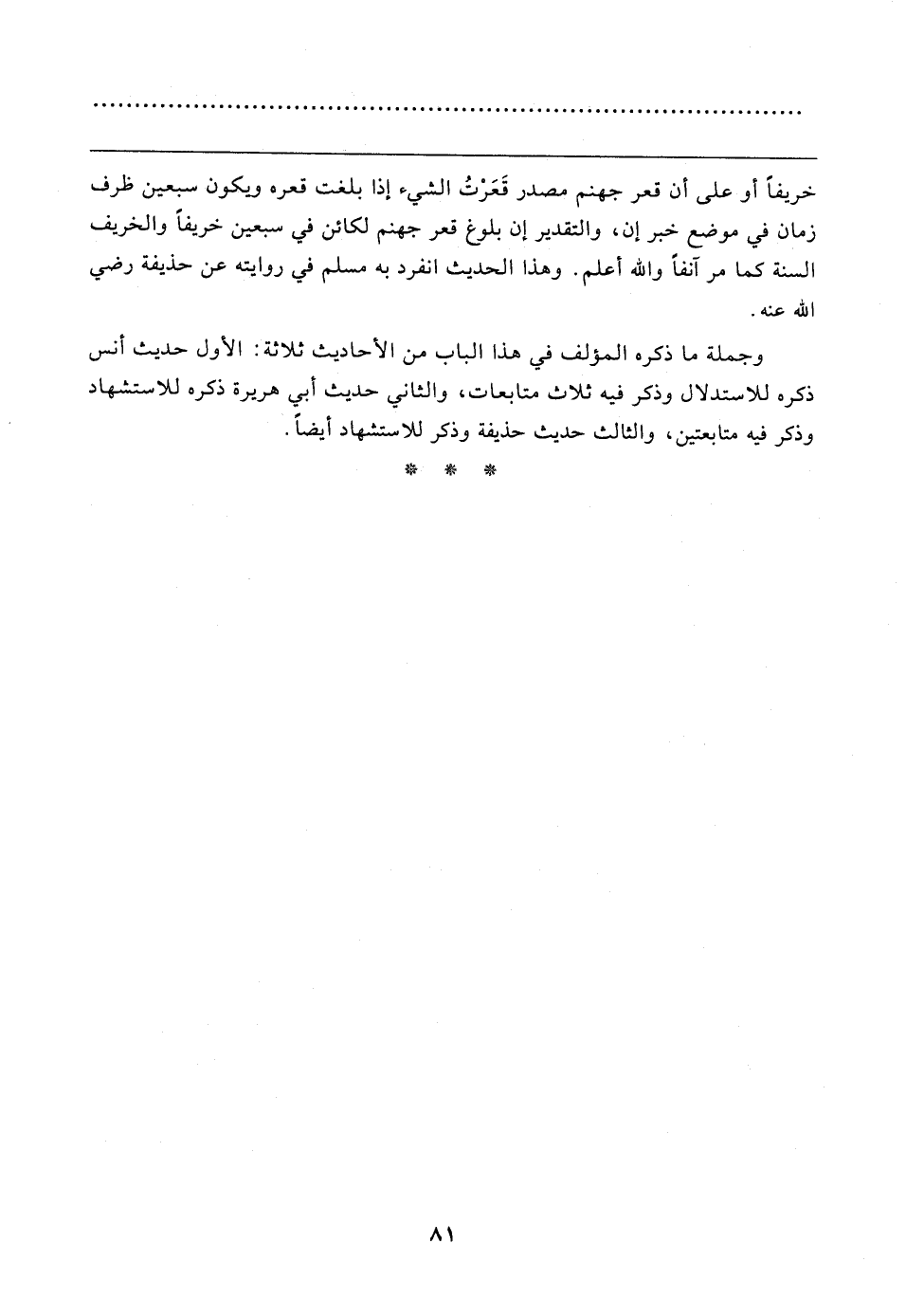 خريفًا أو على أن قعر جهنم مصدر قَعَرْتُ الشيء إذا بلغت قعره ويكون سبعين ظرف زمان في موضع خبر إن، والتقدير إن بلوغ قعر جهنم لكائن في سبعين خريفًا والخريف السنة كما مر آنفًا والله أعلم. وهذا الحديث انفرد به مسلم في روايته عن حذيفة رضي الله عنه.