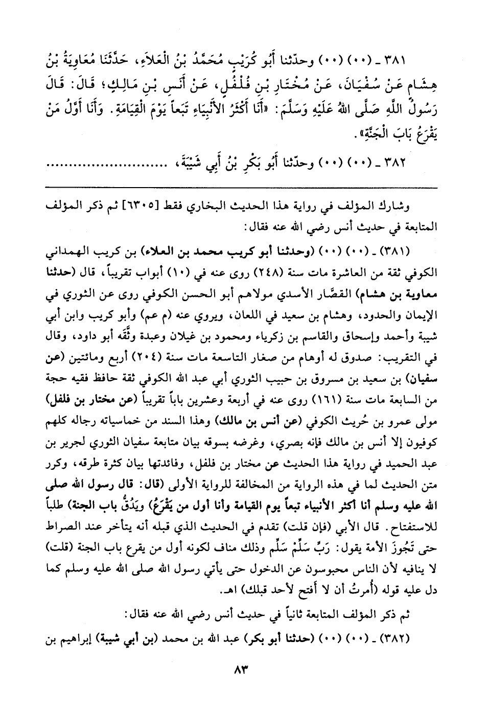 (٣٨١) - (٠٠) (٠٠) (وحدثنا أبو كريب محمد بن العلاء) بن كريب الهمداني الكوفي ثقة من العاشرة مات سنة (٢٤٨) روى عنه في (١٠) أبواب تقريبًا، قال (حدثنا معاوية بن هشام) القصَّار الأسدي مولاهم أبو الحسن الكوفي روى عن الثوري في الإيمان والحدود، وهشام بن سعيد في اللعان، ويروي عنه (م عم) وأبو كريب وابن أبي شيبة وأحمد وإسحاق والقاسم بن زكرياء ومحمود بن غيلان وعبدة وثَّقَه أبو داود، وقال في التقريب: صدوق له أوهام من صغار التاسعة مات سنة (٢٠٤) أربع ومائتين (عن سفيان) بن سعيد بن مسروق بن حبيب الثوري أبي عبد الله الكوفي ثقة حافظ فقيه حجة من السابعة مات سنة (١٦١) روى عنه في أربعة وعشرين بابًا تقريبًا (عن مختار بن فلفل) مولى عمرو بن حُريث الكوفي (عن أنس بن مالك) وهذا السند من خماسياته رجاله كلهم كوفيون إلا أنس بن مالك فإنه بصري، وغرضه بسوقه بيان متابعة سفيان الثوري لجرير بن عبد الحميد في رواية هذا الحديث عن مختار بن فلفل، وفائدتها بيان كثرة طرقه، وكرر متن الحديث لما في هذه الرواية من المخالفة للرواية الأولى (قال: قال رسول الله صلى الله عليه وسلم أنا أكثر الأنبياء تبعًا يوم القيامة وأنا أول من يَقْرَعُ) ويَدُقُّ باب الجنة) طلبًا للاستفتاح. قال الأبي (فإن قلت) تقدم في الحديث الذي قبله أنه يتأخر عند الصراط حتى تَجُوزَ الأمة يقول: رَبِّ سَلِّمْ سَلِّم وذلك مناف لكونه أول من يقرع باب الجنة (قلت) لا ينافيه لأن الناس محبوسون عن الدخول حتى يأتي رسول الله صلى الله عليه وسلم كما دل عليه قوله (أمرتُ أن لا أفتح لأحد قبلك) اهـ.