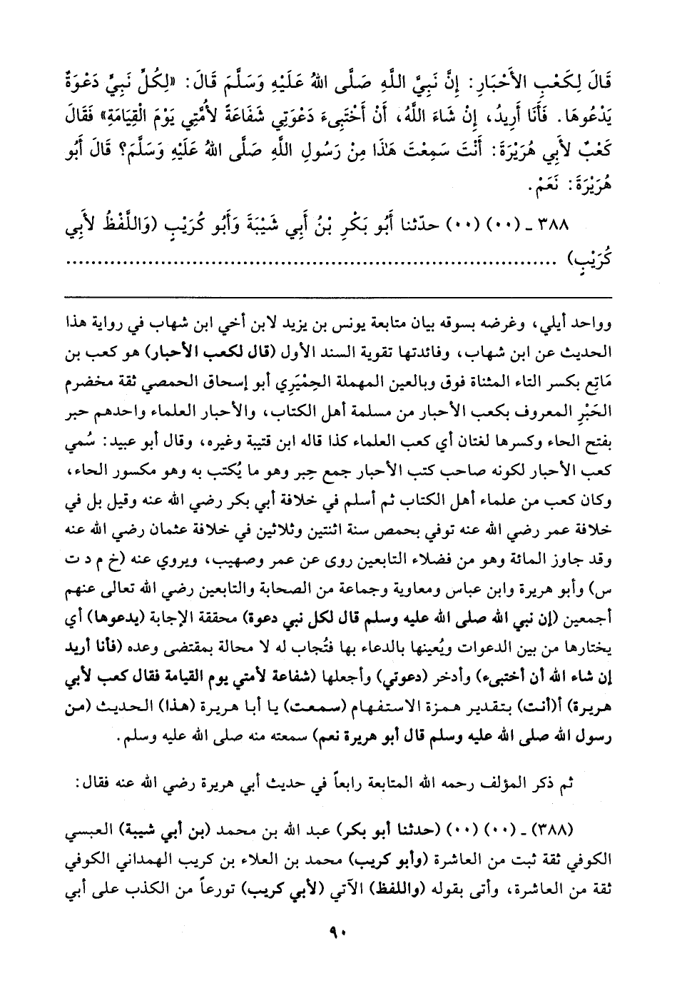 قَال لِكَعْبِ الأَحْبَارِ: إِن نَبِيَّ اللهِ صَلَّى اللهُ عَلَيهِ وَسَلَّمَ قَال: "لِكُلِّ نَبِيٍّ دَعْوَةٌ يَدْعُوهَا. فَأنَا أَرِيدُ، إِنْ شَاءَ اللهُ، أَنْ أَختَبِئَ دَعْوَتِي شَفَاعَةً لأُمَّتِي يَوْمَ الْقِيَامَةِ" فَقَال كَعْبٌ لأبِي هُرَيرَةَ: أَنْتَ سَمِعْتَ هَذَا مِنْ رَسُولِ اللهِ صَلَّى اللهُ عَلَيهِ وَسَلَّمَ؟ قَال أَبُو هُرَيرَةَ: نَعَمْ.