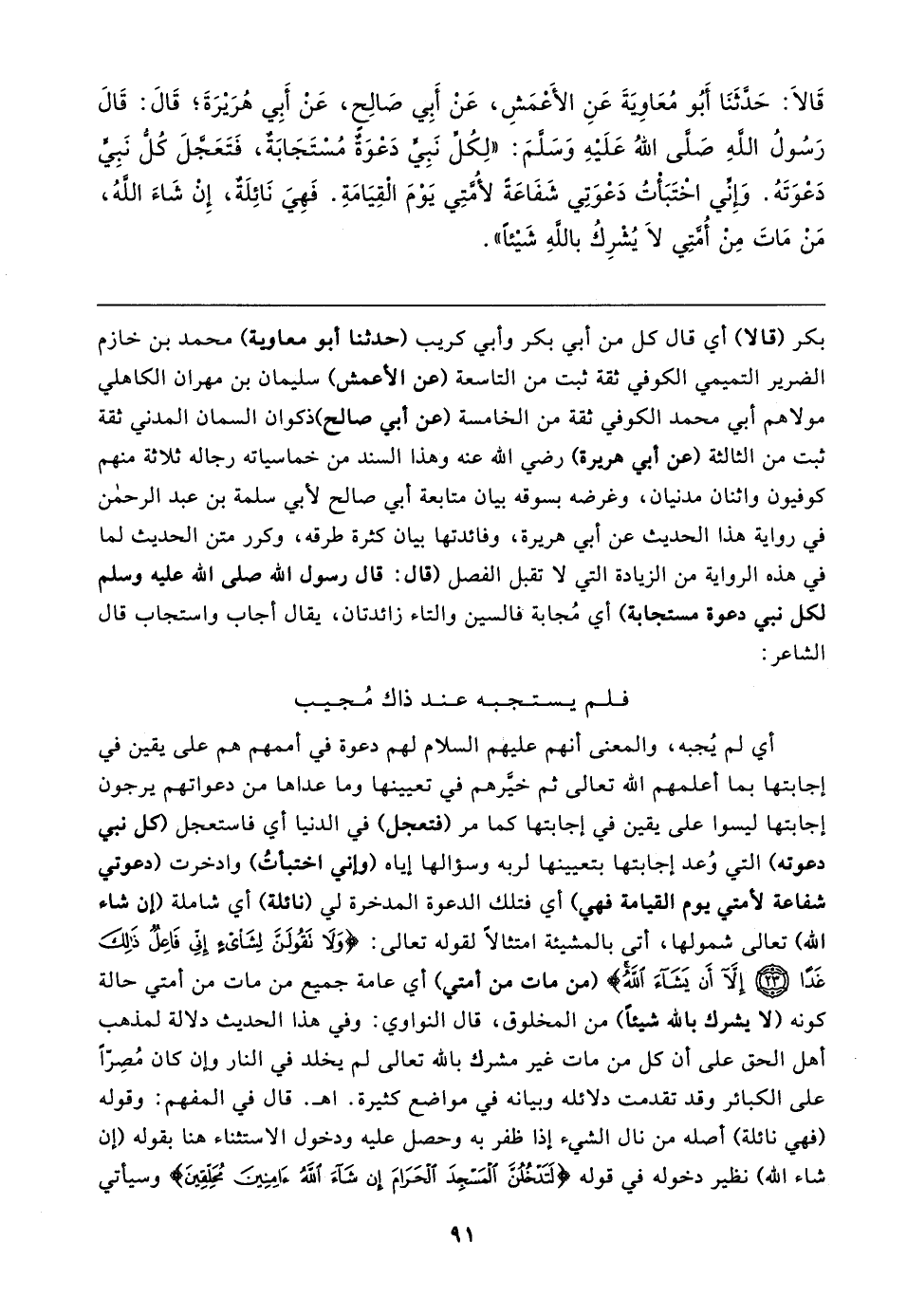 قَالا: حَدَّثَنَا أَبُو مُعَاوَيةَ عَنِ الأعمَشِ، عَنْ أَبِي صَالِحٍ، عَنْ أَبِي هُرَيرَةَ؛ قَال: قَال رَسُولُ اللهِ صَلَّى اللهُ عَلَيهِ وَسَلَّمَ: "لِكُل نَبِيٍّ دَعْوَةٌ مُسْتَجَابَةٌ، فَتَعَجَّلَ كُلِّ نَبِيٍّ دَعْوَتَهُ. وَإِنِّي اخْتَبَأتُ دَعْوَتِي شَفَاعَةً لأُمَّتِي يَوْمَ الْقِيَامَةِ. فَهِيَ نَائِلَةٌ، إِنْ شَاءَ اللهُ، مَنْ مَاتَ مِنْ أُمَّتِي لَا يُشْرِكُ باللهِ شَيئًا"