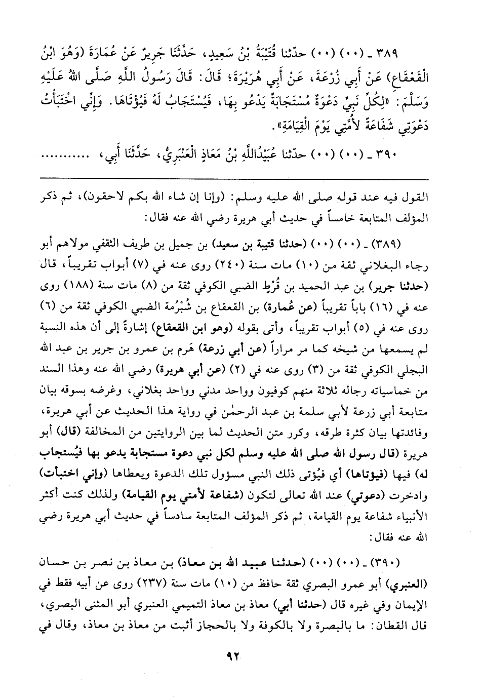 (٣٨٩) - (٠٠) (٠٠) (حدثنا قتيبة بن سعيد) بن جميل بن طريف الثقفي مولاهم أبو رجاء البغلاني ثقة من (١٠) مات سنة (٢٤٠) روى عنه في (٧) أبواب تقريبًا، قال (حدثنا جرير) بن عبد الحميد بن قُرْطٍ الضبي الكوفي ثقة من (٨) مات سنة (١٨٨) روى عنه في (١٦) بابًا تقريبًا (عن عُمارة) بن القعقاع بن شُبْرُمة الضبي الكوفي ثقة من (٦) روى عنه في (٥) أبواب تقريبًا، وأتى بقوله (وهو ابن القعقاع) إشارةً إلى أن هذه النسبة لم يسمعها من شيخه كما مر مرارًا (عن أبي زرعة) هَرم بن عمرو بن جرير بن عبد الله البجلي الكوفي ثقة من (٣) روى عنه في (٢) (عن أبي هريرة) رضي الله عنه وهذا السند من خماسياته رجاله ثلاثة منهم كوفيون وواحد مدني وواحد بغلاني، وغرضه بسوقه بيان متابعة أبي زرعة لأبي سلمة بن عبد الرحمن في رواية هذا الحديث عن أبي هريرة، وفائدتها بيان كثرة طرقه، وكرر متن الحديث لما بين الروايتين من المخالفة (قال) أبو هريرة (قال رسول الله صلى الله عليه وسلم لكل نبي دعوة مستجابة يدعو بها فيُستجاب له) فيها (فيؤتاها) أي فيُؤتى ذلك النبي مسؤول تلك الدعوة ويعطاها (وإني اختبأت) وادخرت (دعوتي) عند الله تعالى لتكون (شفاعة لأمتي يوم القيامة) ولذلك كنت أكثر الأنبياء شفاعة يوم القيامة، ثم ذكر المؤلف المتابعة سادسًا في حديث أبي هريرة رضي الله عنه فقال: