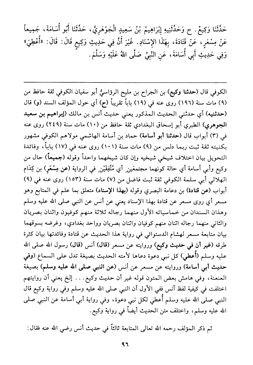 الكوفي قال (حدثنا وكيع) بن الجراح بن مليح الرؤاسيُّ أبو سفيان الكوفي ثقة حافظ من (٩) مات سنة (١٩٦) روى عنه في (١٩) بابًا تقريبًا (ح) أي حول المؤلف السند (و) قال (حدثنيه) أي حدثني الحديث المذكور يعني حديث أنس بن مالك (إبراهيم بن سعيد الجوهري) الطبري أبو إسحاق البغدادي ثقة حافظ من (١٠) مات سنة (٢٤٩) روى عنه في (٣) أبواب قال (حدثنا أبو أسامة) حماد بن أسامة الهاشمي مولاهم الكوفي مشهور بكنيته ثقة ثبت ربما دلس من (٩) مات سنة (١٠١) روى عنه في (١٧) بابا، وفائدة التحويل بيان اختلاف شيخي شيخيه وإن كان شيخهما واحدًا وقوله (جميعًا) حال من وكيع وأبي أسامة أي حالة كونهما مجتمعَينِ أي مُتَّفِقَينِ في الرواية (عن مِسْعَرِ) بن كِدَام الهلالي أبي سلمة الكوفي ثقة ثبت فاضل من (٧) مات سنة (١٥٣) روى عنه في (٩) أبواب (عن قتادة) بن دعامة البصري وقوله (بهذا الإسناد) متعلق بما علم في المتابع وهو مسعر أي روى مسعر عن قتادة بهذا الإسناد يعني عن أنس عن النبي صلى الله عليه وسلم وهذان السندان من خماسياته الأول منهما رجاله ثلاثة منهم كوفيون واثنان بصريان والثاني منهما رجاله اثنان منهم كوفيان واثنان بصريان وواحد بغدادي، وغرضه بسوقهما بيان متابعة مسعر لهشام الدستوائي في رواية هذا الحديث عن قتادة وفائدتها بيان كثرة طرقه (غير أن في حديث وكيع) وروايته عن مسعر (قال) أنس (قال) رسول الله صلى الله عليه وسلم (أُعطي) كل نبي دعوة دعاها لأمته الحديث بصيغة تدل على السماع (وفي حديث أبي أسامة) وروايته عن مسعر عن أنس (عن النبي صلى الله عليه وسلم) بصيغة العنعنة، وفي هامش بعض المتون قوله غير أن حديث وكيع ... إلخ يعني أن روايتهم اختلفت في كيفية لفظ أنس ففي الأول أن النبي صلى الله عليه وسلم وفي رواية وكيع قال النبي صلى الله عليه وسلم أُعطي لكل نبي دعوة، وفي رواية أبي أسامة عن النبي صلى الله عليه وسلم، واختلف متن الحديث أيضًا في رواية وكيع.