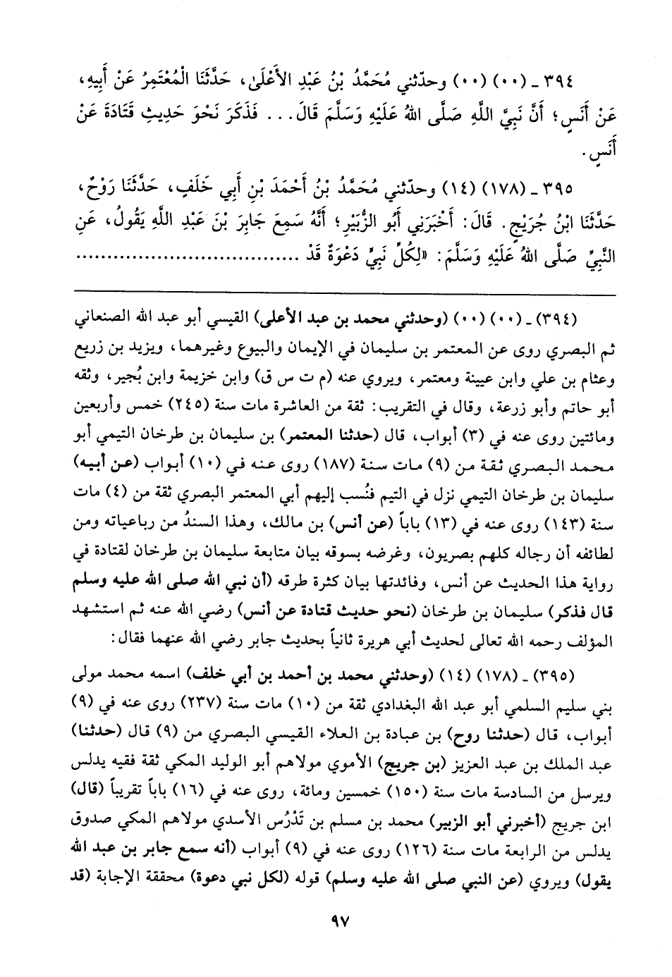 ٣٩٤ - (٠٠) (٠٠) وحدّثني مُحَمَّدُ بْنُ عَبْدِ الأَعْلَى، حَدَّثَنَا الْمُعْتَمِرُ عَنْ أبِيهِ، عَنْ أَنَسٍ؛ أن نَبِيَّ اللهِ صَلَّى اللهُ عَلَيهِ وَسَلَّمَ قَال ... فَذَكَرَ نَحْوَ حَدِيثِ قَتَادَةَ عَنْ أَنَسٍ.