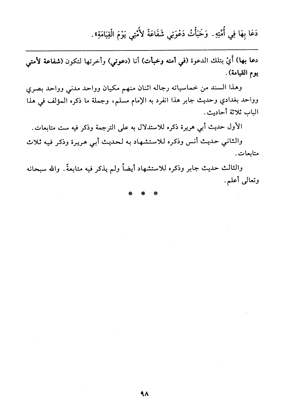دَعَا بِهَا فِي أُمَّتِهِ. وَخَبَأْتُ دَعْوَتِي شَفَاعَةً لأُمَّتِي يَوْمَ الْقِيَامَةِ"