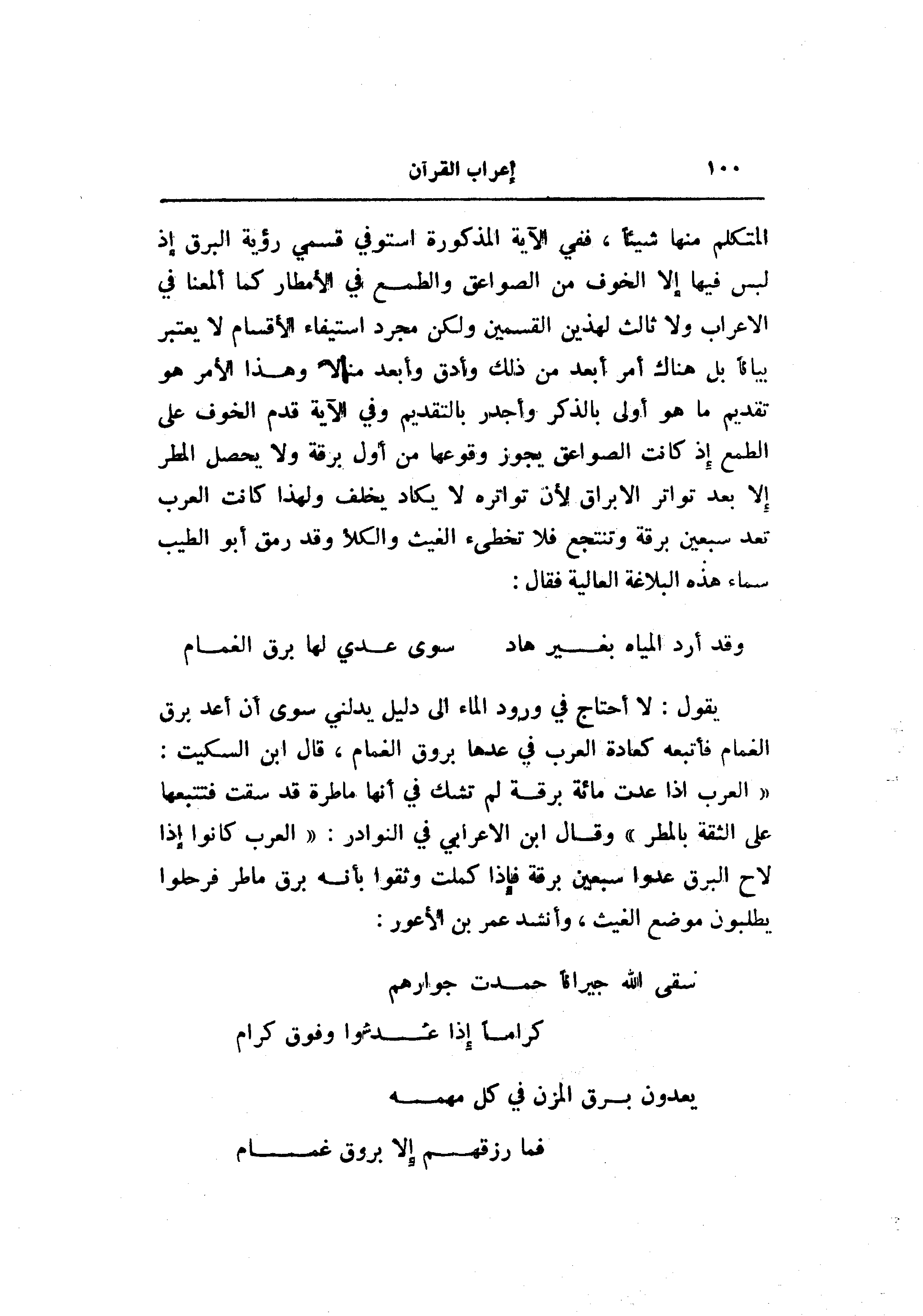 المتكلم منها شيئا، ففي الآية المذكورة استوفي قسمي رؤية البرق إذ لبس فيها إلا الخوف من الصواعق والطمع في الأمطار كما ألمعنا في الاعراب ولا ثالث لهذين القسمين ولكن مجرد استيفاء الأقسام لا يعتبر بيانا بل هناك أمر أبعد من ذلك وأدق وأبعد منالا وهذا الأمر هو تقديم ما هو أولى بالذكر وأجدر بالتقديم وفي الآية قدم الخوف على الطمع إذ كانت الصواعق يجوز وقوعها من أول برقة ولا يحصل المطر إلا بعد تواتر الا براق لأن تواتره لا يكاد يخلف ولهذا كانت العرب تعد سبعين برقة وتنتجع فلا تخطىء الغيث والكلأ وقد رمق أبو الطيب سماء هذه البلاغة العالية فقال: