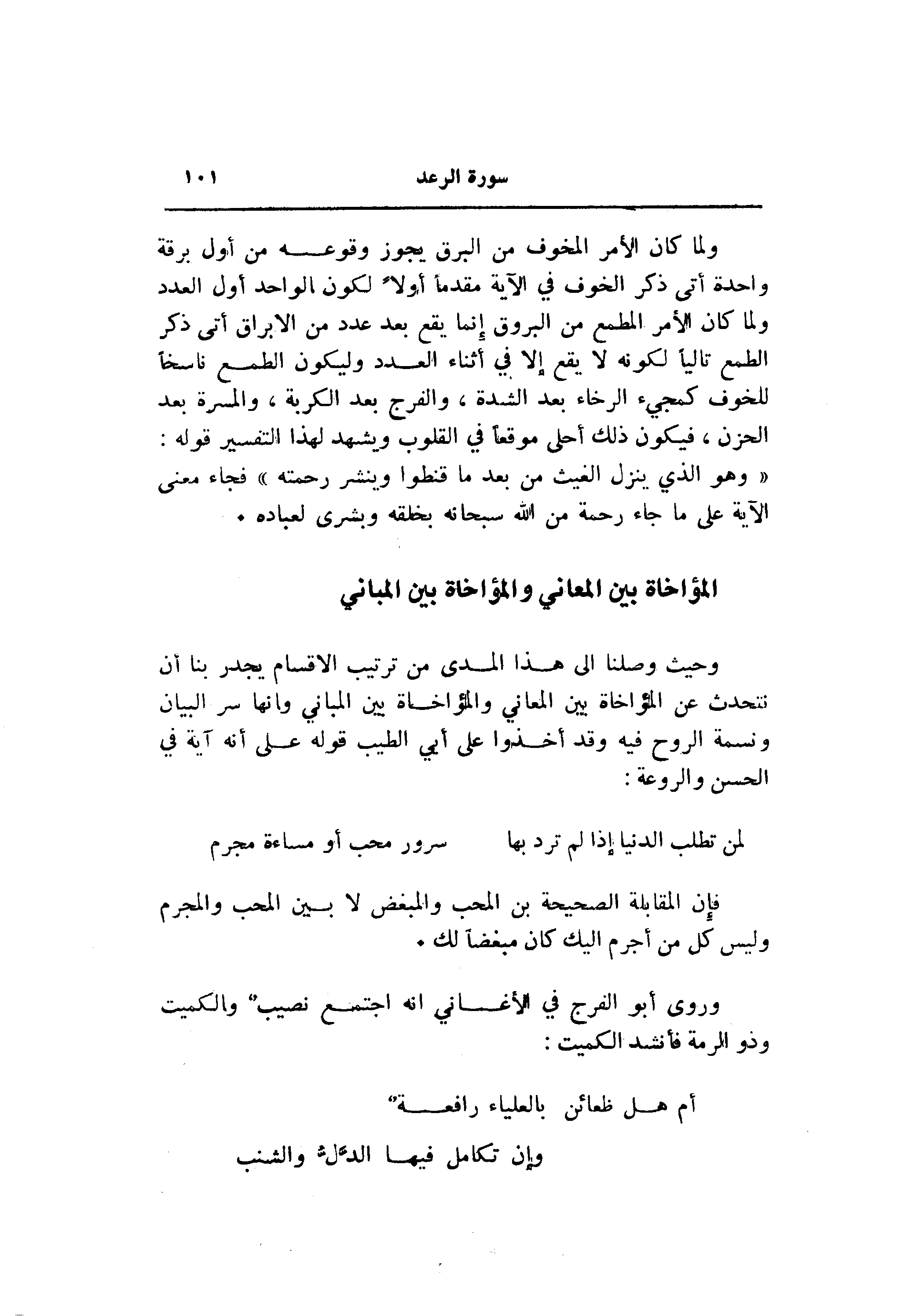 وحيث وصلنا الى هذا المدى من ترتيب الاقسام يجدر بنا أن نتحدث عن المؤاخاة بين المعاني والمؤاخاة بين المباني وانها سر البيان ونسمة الروح فيه وقد أخذوا على أبي الطيب قوله على أنه آية في الحسن والروعة:
