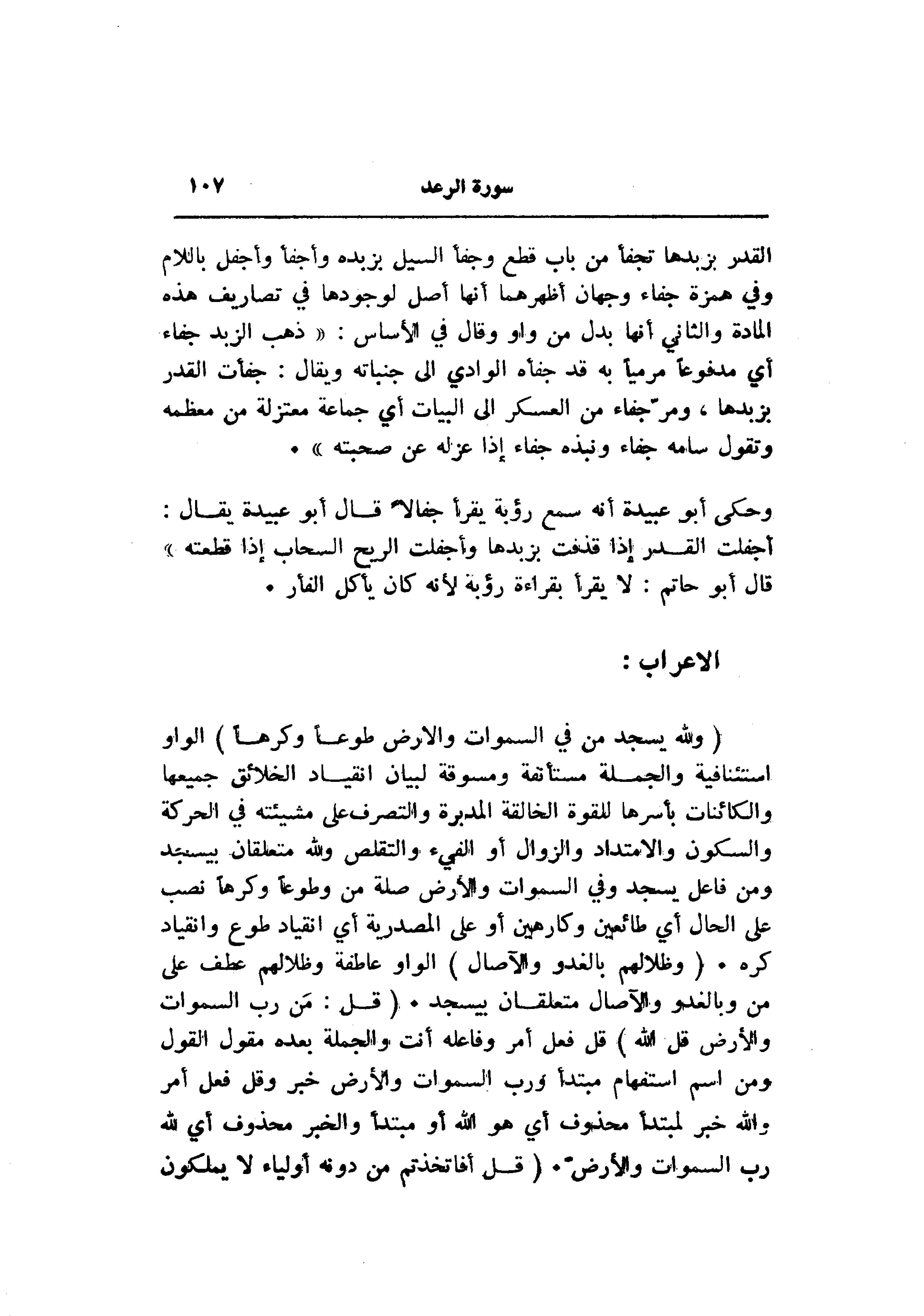 (وَلِلَّهِ يَسْجُدُ مَنْ فِي السَّماواتِ وَالْأَرْضِ طَوْعاً وَكَرْهاً) الواو استئنافية والجملة مستأنفة ومسوقة لبيان انقياد الخلائق جميعها والكائنات بأسرها للقوة الخالقة المدبرة والتصرف على مشيئته في الحركة والسكون والامتداد والزوال أو الفيء والتقلص ولله متعلقان بيسجد ومن فاعل يسجد وفي السموات والأرض صلة من وطوعا وكرها نصب على الحال أي طائعين وكارهين أو على المصدرية أي انقياد طوع وانقياد كره. (وَظِلالُهُمْ بِالْغُدُوِّ وَالْآصالِ) الواو عاطفة وظلالهم عطف على من وبالغدو والآصال متعلقان بيسجد. (قُلْ: مَنْ رَبُّ السَّماواتِ وَالْأَرْضِ قُلِ اللَّهُ) قل فعل أمر وفاعله أنت والجملة بعده مقول القول ومن اسم استفهام مبتدأ ورب السموات والأرض خبر وقل فعل أمر والله خبر لمبتدأ محذوف أي هو الله أو مبتدأ والخبر محذوف أي لله رب السموات والأرض. (قُلْ أَفَاتَّخَذْتُمْ مِنْ دُونِهِ أَوْلِياءَ لا يَمْلِكُونَ لِأَنْفُسِهِمْ نَفْعاً وَلا ضَرًّا)