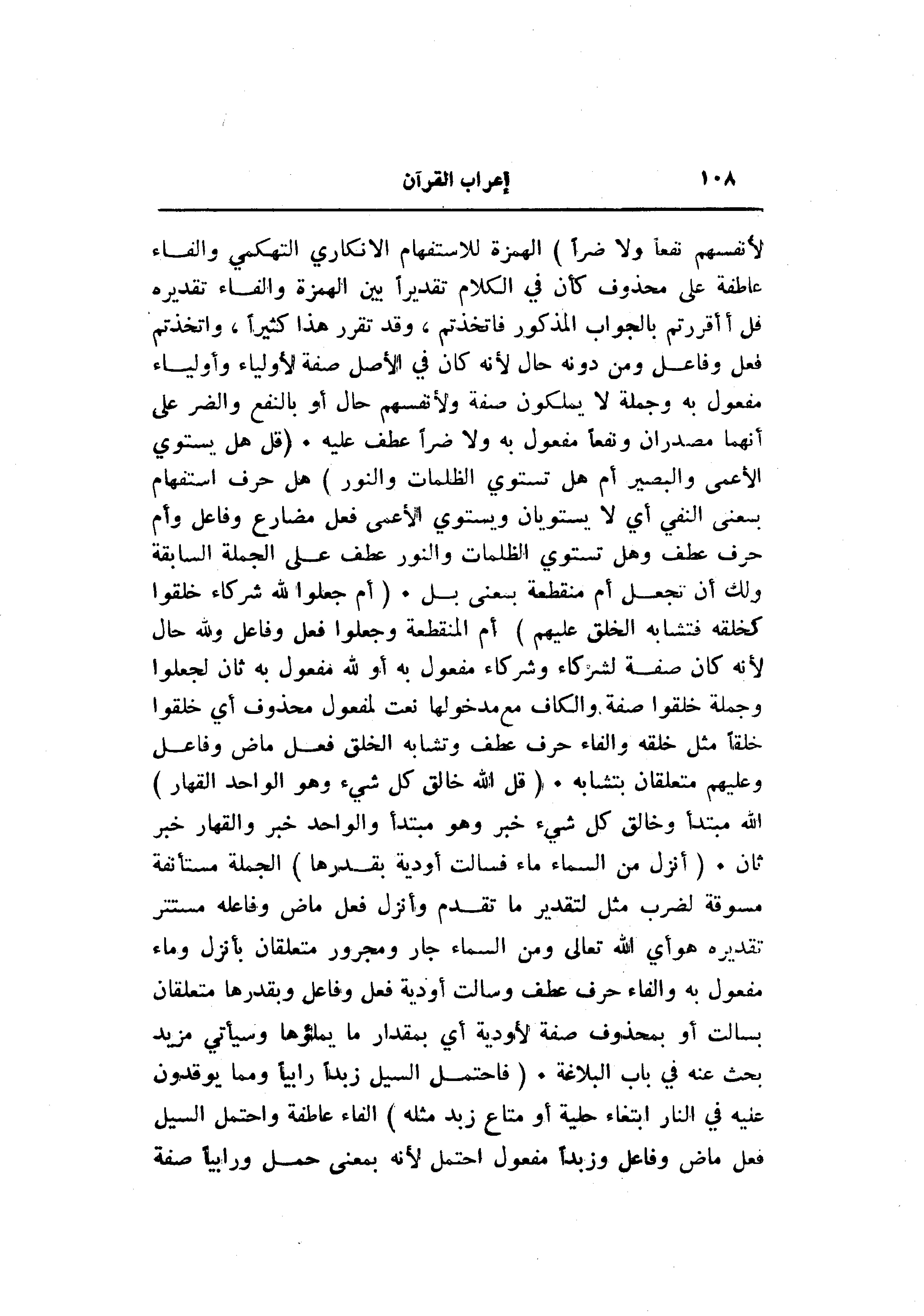 الهمزة للاستفهام الانكاري التهكمي والفاء عاطفة على محذوف كأن في الكلام تقديرا بين الهمزة والفاء تقديره قل أأقررتم بالجواب المذكور فاتخذتم، وقد تقرر هذا كثيرا، واتخذتم فعل وفاعل ومن دونه حال لأنه كان في الأصل صفة لأولياء وأولياء مفعول به وجملة لا يملكون صفة ولأنفسهم حال أو بالنفع والضر على أنهما مصدر ان ونفعا مفعول به ولا ضرا عطف عليه. (قُلْ هَلْ يَسْتَوِي الْأَعْمى وَالْبَصِيرُ أَمْ هَلْ تَسْتَوِي الظُّلُماتُ وَالنُّورُ) هل حرف استفهام بمعنى النفي أي لا يستويان ويستوي الأعمى فعل مضارع وفاعل وأم حرف عطف وهل تستوي الظلمات والنور عطف على الجملة السابقة ولك أن تجعل أم منقطعة بمعنى بل. (أَمْ جَعَلُوا لِلَّهِ شُرَكاءَ خَلَقُوا كَخَلْقِهِ فَتَشابَهَ الْخَلْقُ عَلَيْهِمْ) أم المنقطعة وجعلوا فعل وفاعل ولله حال لأنه كان صفة لشركاء وشركاء مفعول به أو لله مفعول به ثان لجعلوا وجملة خلقوا صفة والكاف مع مدخولها نعت لمفعول محذوف أي خلقوا خلقا مثل خلقه والفاء حرف عطف وتشابه الخلق فعل ماض وفاعل وعليهم متعلقان بتشابه. (قُلِ اللَّهُ خالِقُ كُلِّ شَيْءٍ وَهُوَ الْواحِدُ الْقَهَّارُ) الله مبتدأ وخالق كل شيء خبر وهو مبتدأ والواحد خبر والقهار خبر ثان. (أَنْزَلَ مِنَ السَّماءِ ماءً فَسالَتْ أَوْدِيَةٌ بِقَدَرِها) الجملة مستأنفة مسوقة لضرب مثل لتقدير ما تقدم وأنزل فعل ماض وفاعله مستتر تقديره هو أي الله تعالى ومن السماء جار ومجرور متعلقان بأنزل وماء مفعول به والفاء حرف عطف وسالت أودية فعل وفاعل وبقدرها متعلقان بسالت أو بمحذوف صفة لأودية أي بمقدار ما يملؤها وسيأتي مزيد بحث عنه في باب البلاغة. (فَاحْتَمَلَ السَّيْلُ زَبَداً رابِياً وَمِمَّا يُوقِدُونَ عَلَيْهِ فِي النَّارِ ابْتِغاءَ حِلْيَةٍ أَوْ مَتاعٍ زَبَدٌ مِثْلُهُ) الفاء عاطفة واحتمل السيل فعل ماض وفاعل وزبدا مفعول احتمل لأنه بمعنى حمل ورابيا صفة