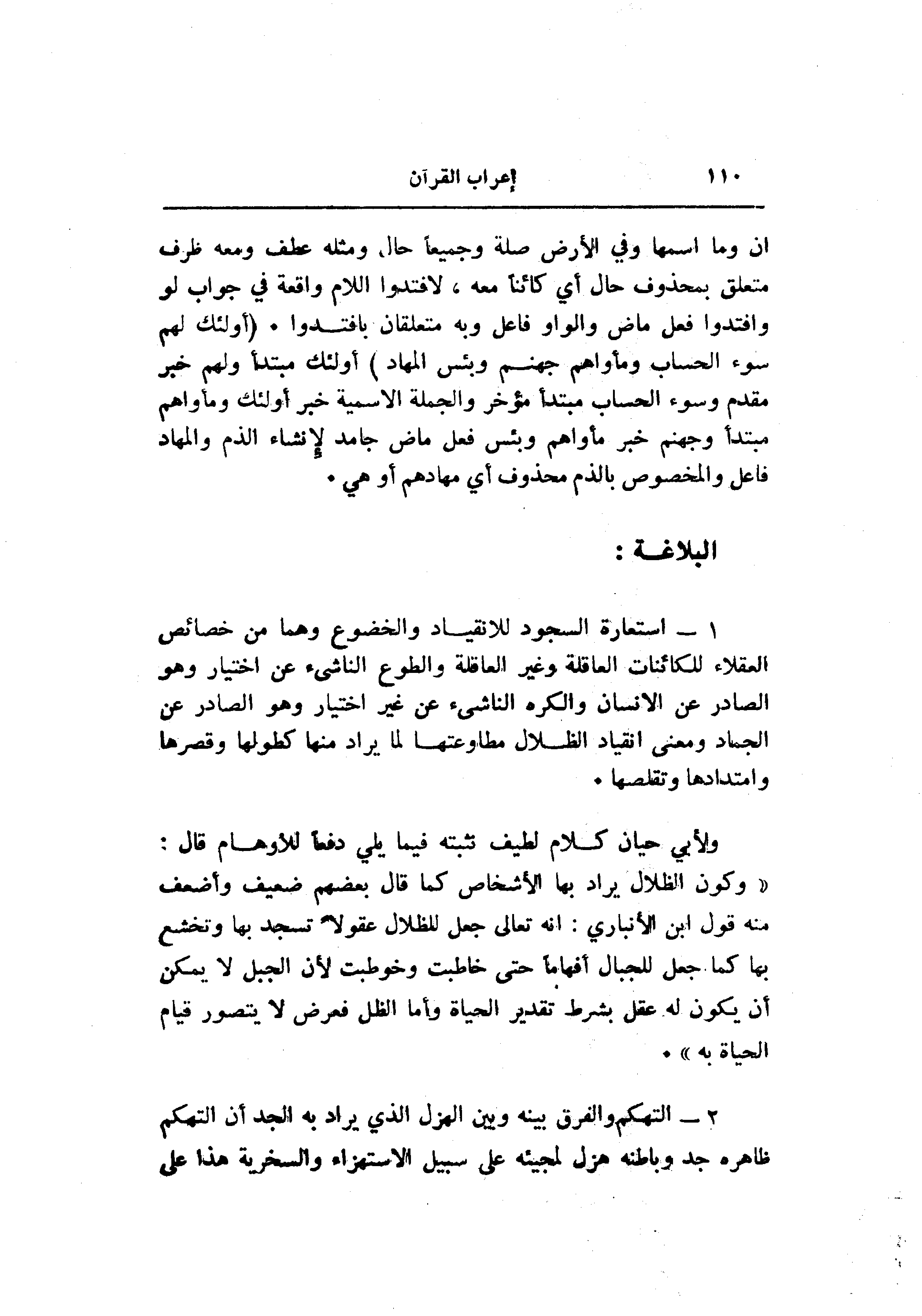 1- استعارة السجود للانقياد والخضوع وهما من خصائص العقلاء للكائنات العاقلة وغير العاقلة والطوع الناشئ عن اختيار وهو الصادر عن الإنسان والكره الناشئ عن غير اختيار وهو الصادر عن الجماد ومعنى انقياد الظلال مطاوعتها لما يراد منها كطولها وقصرها وامتدادها وتقلصها.