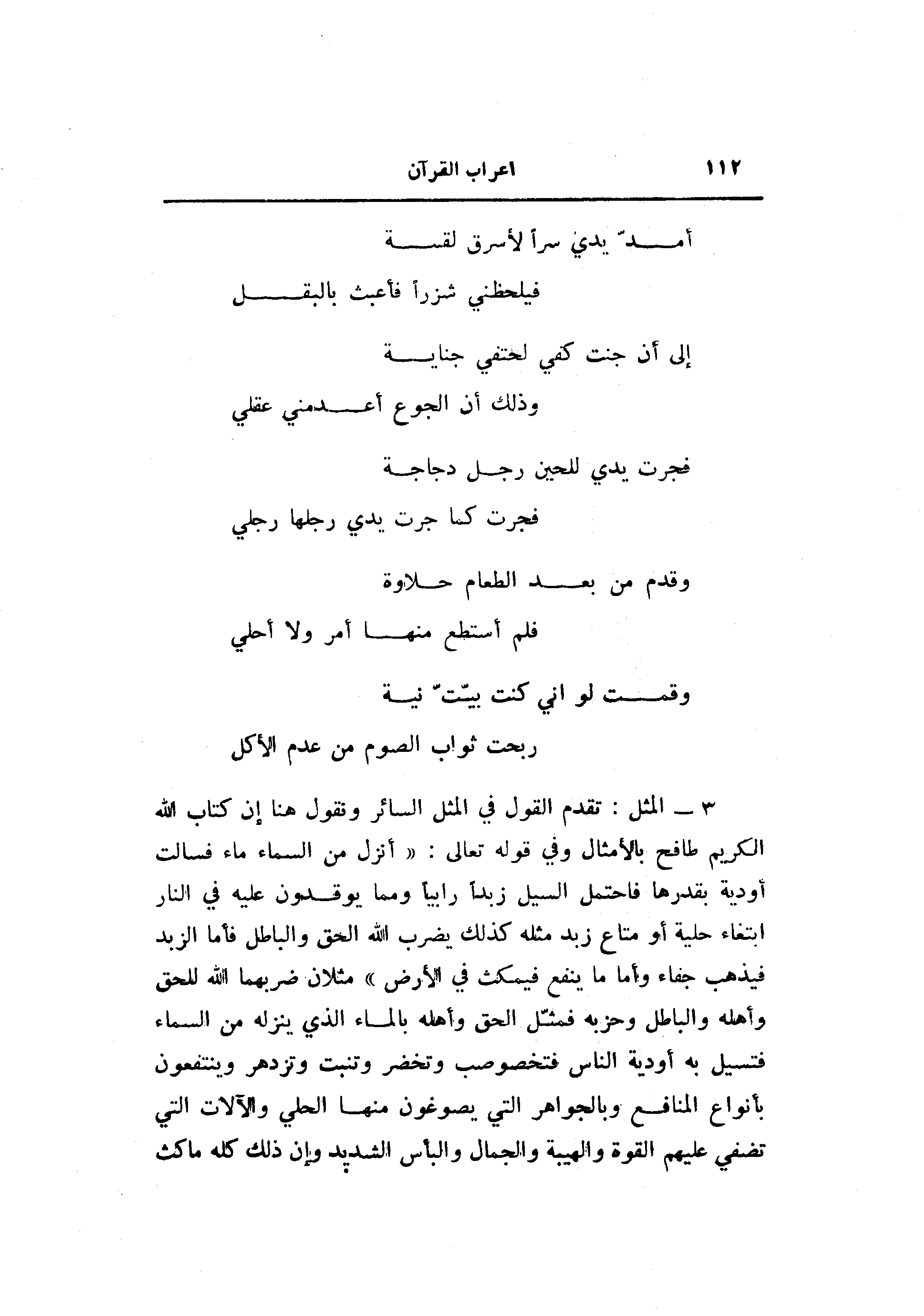 3- المثل: تقدم القول في المثل السائر ونقول هنا إن كتاب الله الكريم طافح بالأمثال وفي قوله تعالى: «أنزل من السماء ماء فسالت أودية بقدرها فاحتمل السيل زبدا رابيا ومما يوقدون عليه في النار ابتغاء حلية أو متاع زبد مثله كذلك يضرب الله الحق والباطل فأما الزبد فيذهب جفاء وأما ما ينفع فيمكث في الأرض» مثلان ضربهما الله للحق وأهله والباطل وحزبه فمثّل الحق وأهله بالماء الذي ينزله من السماء فتسيل به أودية الناس فتخصوصب وتخضر وتنبت وتزدهر وينتفعون بأنواع المنافع وبالجواهر التي يصوغون منها الحلي والآلات التي تضفي عليهم القوة والهيبة والجمال والبأس الشديد وإن ذلك كله ماكث