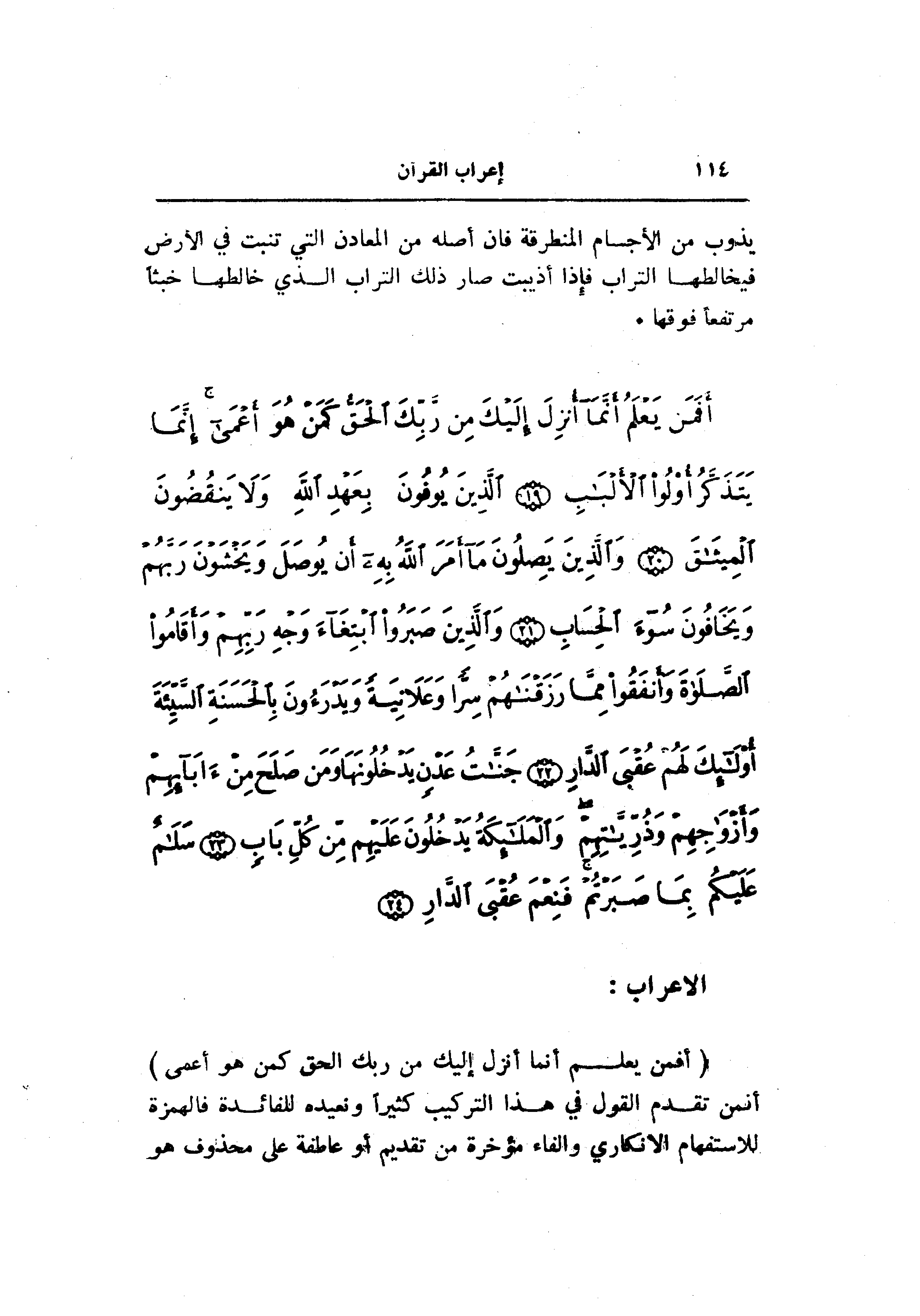 أَفَمَنْ يَعْلَمُ أَنَّما أُنْزِلَ إِلَيْكَ مِنْ رَبِّكَ الْحَقُّ كَمَنْ هُوَ أَعْمى إِنَّما يَتَذَكَّرُ أُولُوا الْأَلْبابِ (19) الَّذِينَ يُوفُونَ بِعَهْدِ اللَّهِ وَلا يَنْقُضُونَ الْمِيثاقَ (20) وَالَّذِينَ يَصِلُونَ ما أَمَرَ اللَّهُ بِهِ أَنْ يُوصَلَ وَيَخْشَوْنَ رَبَّهُمْ وَيَخافُونَ سُوءَ الْحِسابِ (21) وَالَّذِينَ صَبَرُوا ابْتِغاءَ وَجْهِ رَبِّهِمْ وَأَقامُوا الصَّلاةَ وَأَنْفَقُوا مِمَّا رَزَقْناهُمْ سِرًّا وَعَلانِيَةً وَيَدْرَؤُنَ بِالْحَسَنَةِ السَّيِّئَةَ أُولئِكَ لَهُمْ عُقْبَى الدَّارِ (22) جَنَّاتُ عَدْنٍ يَدْخُلُونَها وَمَنْ صَلَحَ مِنْ آبائِهِمْ وَأَزْواجِهِمْ وَذُرِّيَّاتِهِمْ وَالْمَلائِكَةُ يَدْخُلُونَ عَلَيْهِمْ مِنْ كُلِّ بابٍ (23)