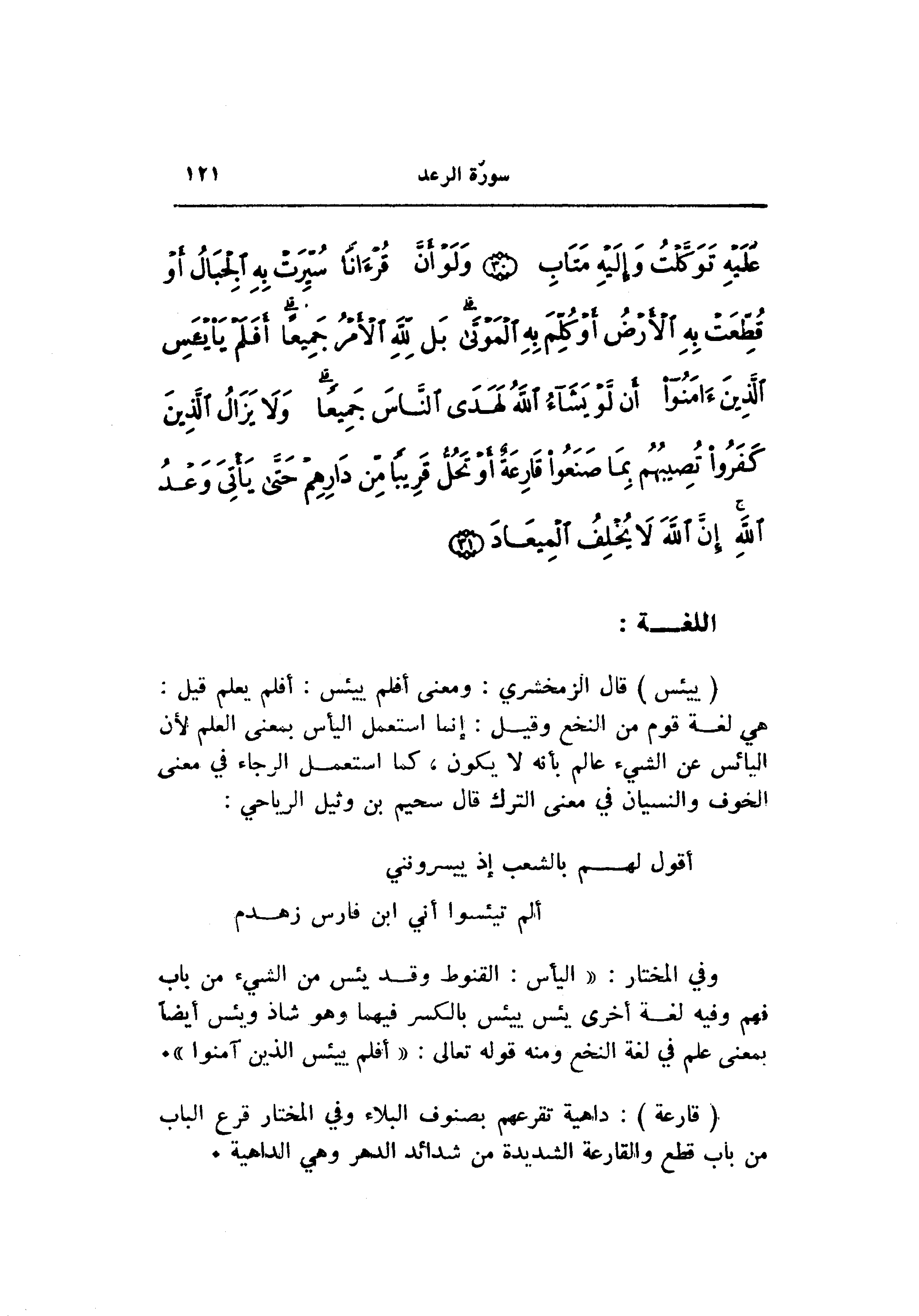 وفي المختار: «اليأس: القنوط وقد يئس من الشيء من باب فهم وفيه لغة أخرى يئس ييئس بالكسر فيهما وهو شاذ ويئس أيضا بمعنى علم في لغة النخع ومنه قوله تعالى: «أفلم ييئس الذين آمنوا» .