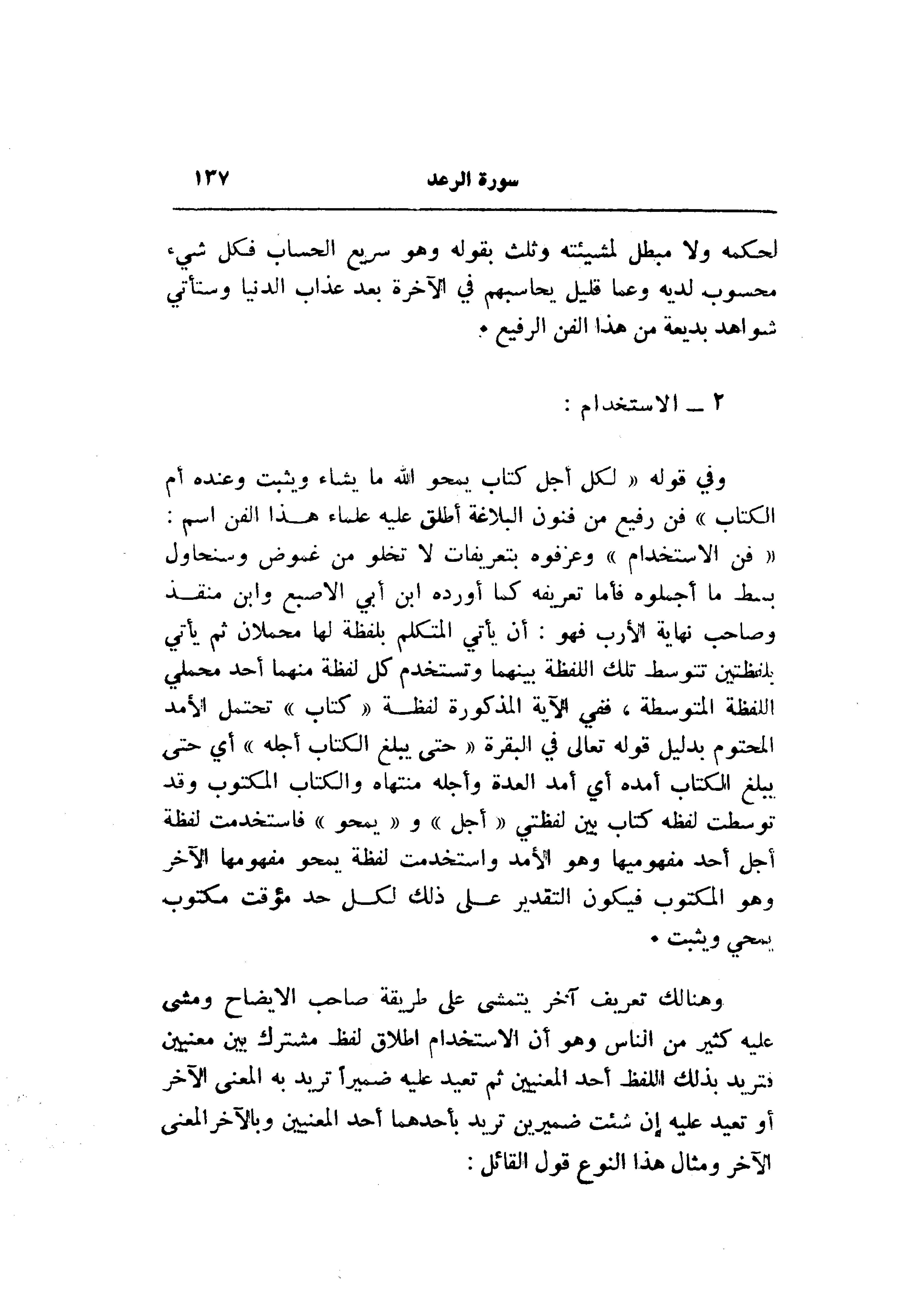 «فن الاستخدام» وعزفوه بتعريفات لا تخلو من غموض وسنحاول بسط ما أجملوه فأما تعريفه كما أورده ابن أبي الإصبع وابن منقذ وصاحب نهاية الأرب فهو: أن يأتي المتكلم بلفظة لها محملان ثم يأتي بلفظتين تتوسط تلك اللفظة بينهما وتستخدم كل لفظة منهما أحد محملي اللفظة المتوسطة، ففي الآية المذكورة لفظة «كتاب» تحتمل الأمد المحتوم بدليل قوله تعالى في البقرة «حتى يبلغ الكتاب أجله» أي حتى يبلغ الكتاب أمده أي أمد العدة وأجله منتهاه والكتاب المكتوب وقد توسطت لفظه كتاب بين لفظتي «أجل» و «يمحو» فاستخدمت لفظة أجل أحد مفهوميها وهو الأمد واستخدمت لفظة يمحو مفهومها الآخر وهو المكتوب فيكون التقدير على ذلك لكل حد مؤقت مكتوب يمحي ويثبت.