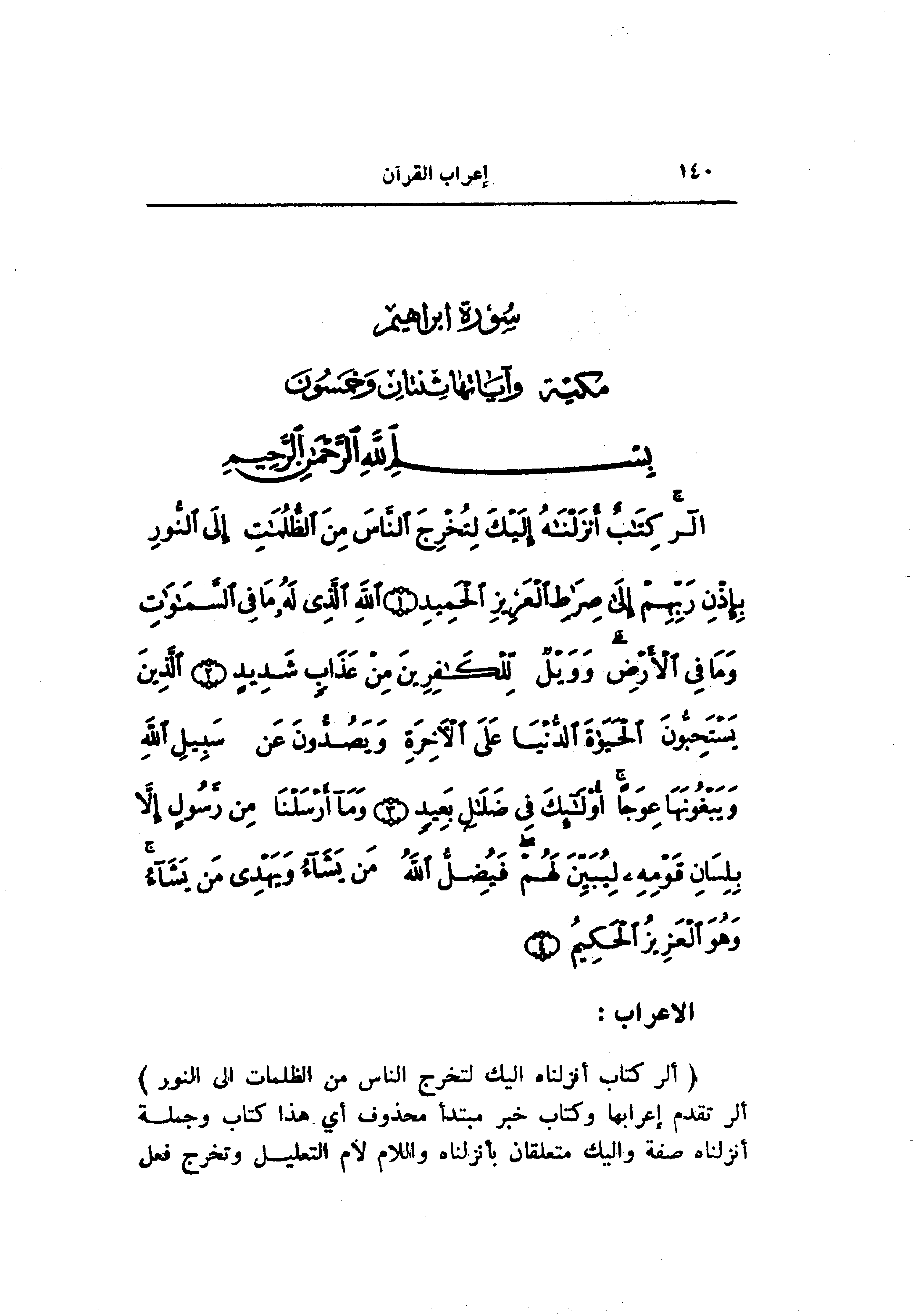 الر كِتابٌ أَنْزَلْناهُ إِلَيْكَ لِتُخْرِجَ النَّاسَ مِنَ الظُّلُماتِ إِلَى النُّورِ بِإِذْنِ رَبِّهِمْ إِلى صِراطِ الْعَزِيزِ الْحَمِيدِ (1) اللَّهِ الَّذِي لَهُ ما فِي السَّماواتِ وَما فِي الْأَرْضِ وَوَيْلٌ لِلْكافِرِينَ مِنْ عَذابٍ شَدِيدٍ (2) الَّذِينَ يَسْتَحِبُّونَ الْحَياةَ الدُّنْيا عَلَى الْآخِرَةِ وَيَصُدُّونَ عَنْ سَبِيلِ اللَّهِ وَيَبْغُونَها عِوَجاً أُولئِكَ فِي ضَلالٍ بَعِيدٍ (3) وَما أَرْسَلْنا مِنْ رَسُولٍ إِلاَّ بِلِسانِ قَوْمِهِ لِيُبَيِّنَ لَهُمْ فَيُضِلُّ اللَّهُ مَنْ يَشاءُ وَيَهْدِي مَنْ يَشاءُ وَهُوَ الْعَزِيزُ الْحَكِيمُ (4)