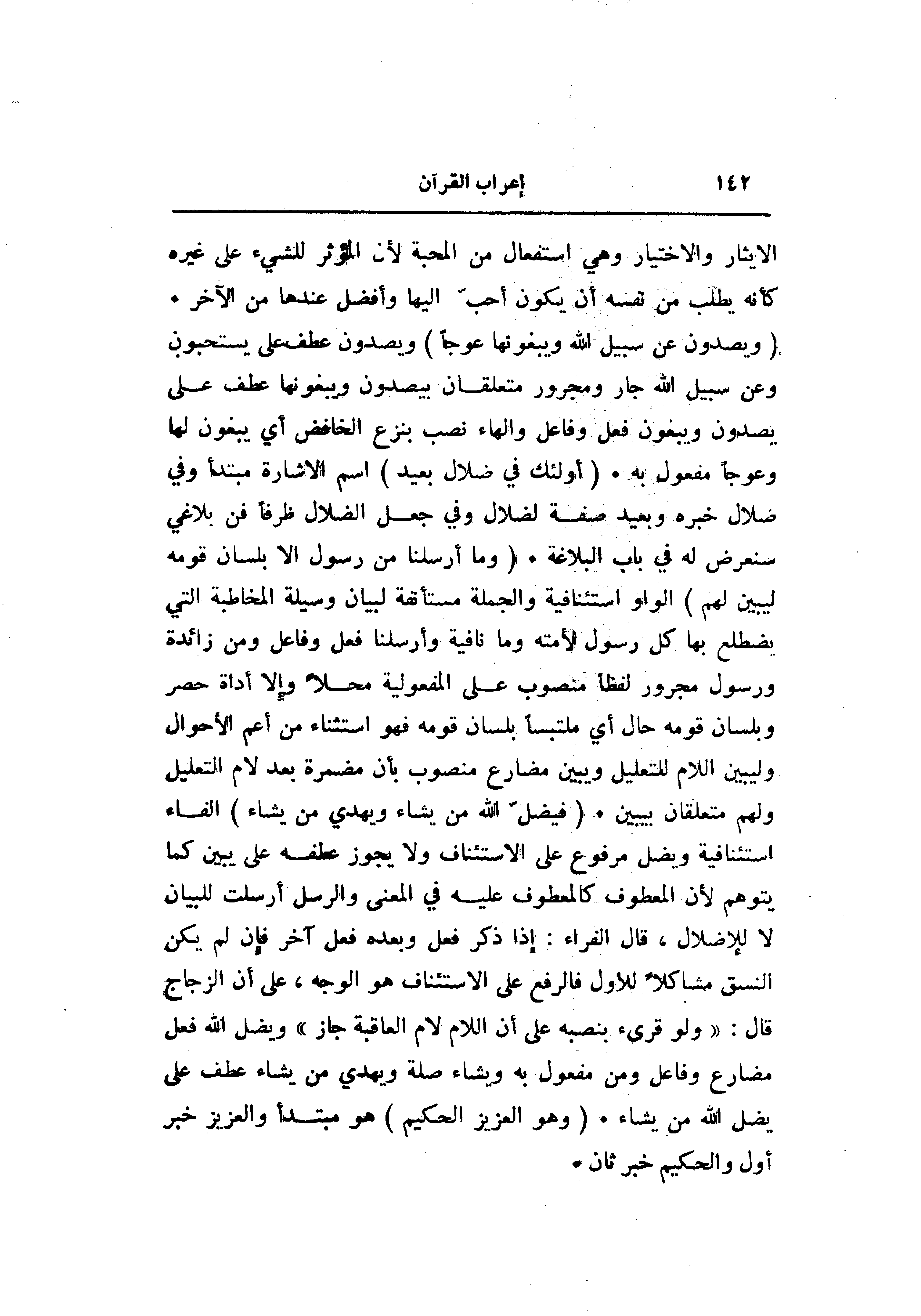 (وَيَصُدُّونَ عَنْ سَبِيلِ اللَّهِ وَيَبْغُونَها عِوَجاً) ويصدون عطف على يستحبون وعن سبيل الله جار ومجرور متعلقان بيصدون ويبغونها عطف على يصدون ويبغون فعل وفاعل والهاء نصب بنزع الخافض أي يبغون لها وعوجا مفعول به. (أُولئِكَ فِي ضَلالٍ بَعِيدٍ) اسم الاشارة مبتدأ وفي ضلال خبره وبعيد صفة لضلال وفي جعل الضلال ظرفا فن بلاغي سنعرض له في باب البلاغة. (وَما أَرْسَلْنا مِنْ رَسُولٍ إِلَّا بِلِسانِ قَوْمِهِ لِيُبَيِّنَ لَهُمْ) الواو استئنافية والجملة مستأنفة لبيان وسيلة المخاطبة التي يظطلع بها كل رسول لأمته وما نافية وأرسلنا فعل وفاعل ومن زائدة ورسول مجرور لفظا منصوب على المفعولية محلا وإلا أداة حصر وبلسان قومه حال أي ملتبسا بلسان قومه فهو استثناء من أعم الأحوال وليبين اللام للتعليل ويبين مضارع منصوب بأن مضمرة بعد لام التعليل ولهم متعلقان بيبين. (فَيُضِلُّ اللَّهُ مَنْ يَشاءُ وَيَهْدِي مَنْ يَشاءُ) الفاء استئنافية ويضل مرفوع على الاستئناف ولا يجوز عطفه على يبين كما يتوهم لأن المعطوف كالمعطوف عليه في المعنى والرسل أرسلت للبيان لا للإضلال، قال الفراء: إذا ذكر فعل وبعده فعل آخر فإن لم يكن النسق مشاكلا للأول فالرفع على الاستئناف هو الوجه، على أن الزجاج قال: «ولو قرىء بنصبه على أن اللام لام العاقبة جاز» ويضل الله فعل مضارع وفاعل ومن مفعول به ويشاء صلة ويهدي من يشاء عطف على يضل الله من يشاء. (وَهُوَ الْعَزِيزُ الْحَكِيمُ) هو مبتدأ والعزيز خبر أول والحكيم خبر ثان.
