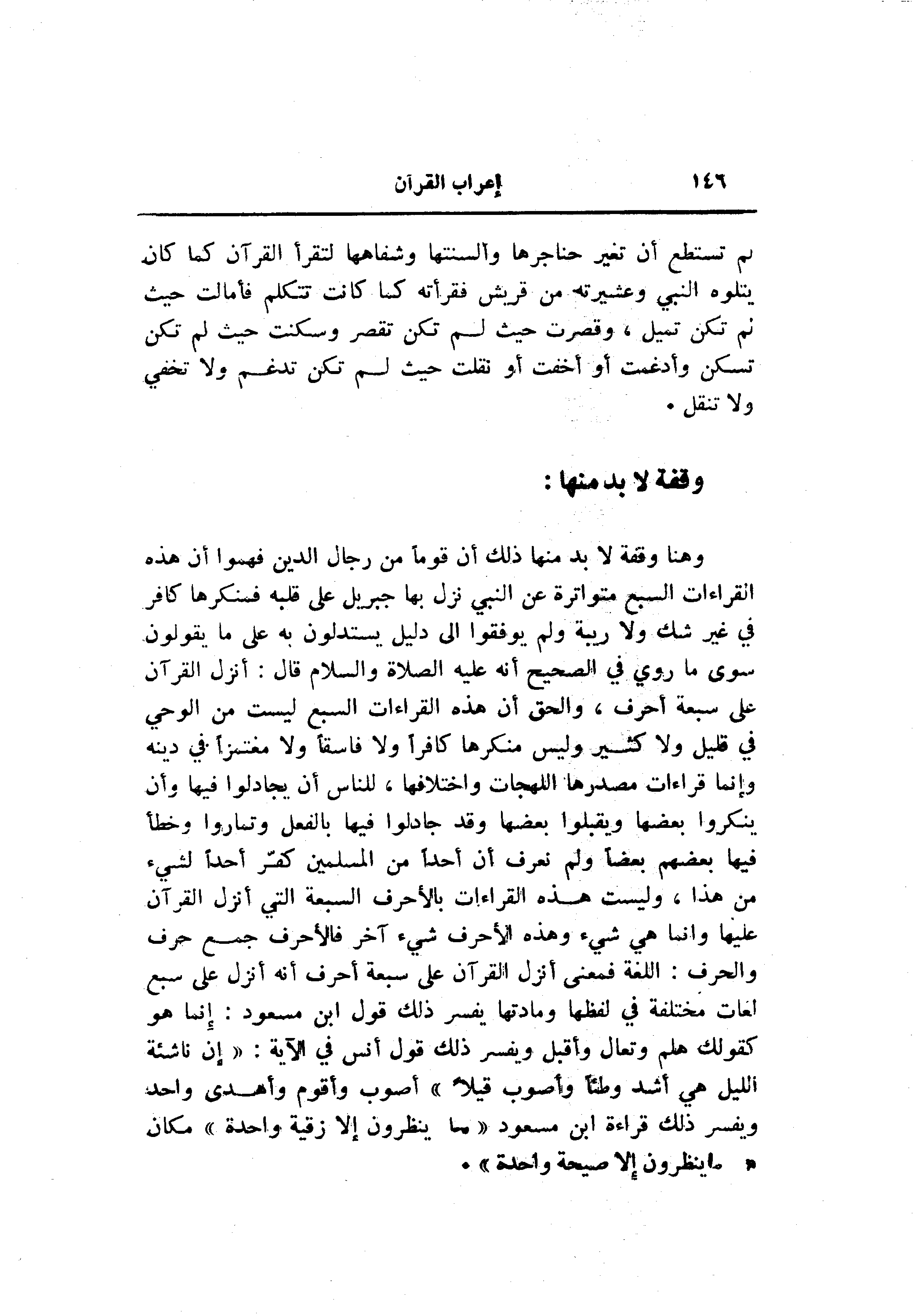 وهنا وقفة لا بد منها ذلك أن قوما من رجال الدين فهموا أن هذه القراءات السبع متواترة عن النبي نزل بها جبريل على قلبه فمنكرها كافر في غير شك ولا ريبة ولم يوفقوا الى دليل يستدلون به على ما يقولون سوى ما روي في الصحيح أنه عليه الصلاة والسلام قال: أنزل القرآن على سبعة أحرف، والحق أن هذه القراءات السبع ليست من الوحي في قليل ولا كثير وليس منكرها كافرا ولا فاسقا ولا مغتمزا في دينه وإنما قراءات مصدرها اللهجات واختلافها، للناس أن يجادلوا فيها وأن ينكروا بعضها ويقبلوا بعضها وقد جادلوا فيها بالفعل وتماروا وخطأ فيها بعضهم بعضا ولم نعرف أن أحدا من المسلمين كفّر أحدا لشيء من هذا، وليست هذا القراءات بالأحرف السبعة التي أنزل القرآن عليها وانما هي شيء وهذه الأحرف شيء آخر فالأحرف جمع حرف والحرف: اللغة فمعنى أنزل القرآن على سبعة أحرف أنه أنزل على سبع لغات مختلفة في لفظها ومادتها يفسر ذلك قول ابن مسعود: إنما هو كقولك هلم وتعال وأقبل ويفسر ذلك قول أنس في الآية: «إن ناشئة الليل هي أشد وطئا وأصوب قيلا» أصوب وأقوم وأهدى واحد ويفسر ذلك قراءة ابن مسعود «ما ينظرون إلا زقية واحدة» مكان «ما ينظرون إلا صيحة واحدة» .