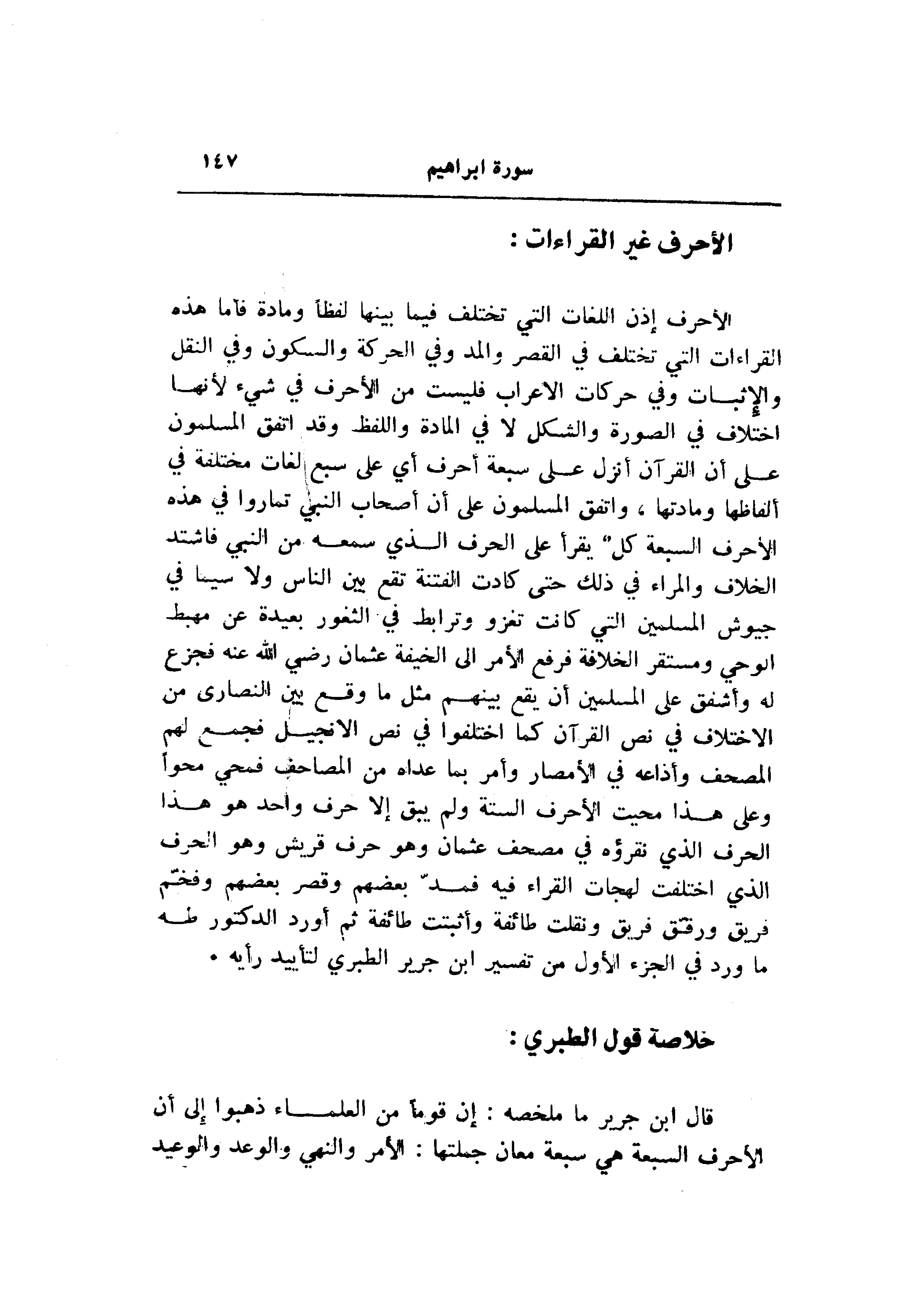 الأحرف إذن اللغات التي تختلف فيما بينها لفظا ومادة فأما هذه القراءات التي تختلف في القصر والمد وفي الحركة والسكون وفي النقل والإثبات وفي حركات الاعراب فليست من الأحرف في شيء لأنها اختلاف في الصورة والشكل لا في المادة واللفظ وقد اتفق المسلمون على أن القرآن أنزل على سبعة أحرف أي على سبع لغات مختلفة في ألفاظها ومادتها، واتفق المسلمون على أن أصحاب النبي تماروا في هذه الأحرف السبعة كل يقرأ على الحرف الذي سمعه من النبي فاشتد الخلاف والمراء في ذلك حتى كادت الفتنة تقع بين الناس ولا سيما في جيوش المسلمين التي كانت تغزو وترابط في الثغور بعيدة عن مهبط الوحي ومستقر الخلافة فرفع الأمر الى الخيفة عثمان رضي الله عنه فجزع له وأشفق على المسلمين أن يقع بينهم مثل ما وقع بين النصارى من الاختلاف في نص القرآن كما اختلفوا في نص الإنجيل فجمع لهم المصحف وأذاعه في الأمصار وأمر بما عداه من المصاحف فمحي محوا وعلى هذا محيت الأحرف الستة ولم يبق إلا حرف واحد هو هذا الحرف الذي نقرؤه في مصحف عثمان وهو حرف قريش وهو الحرف الذي اختلفت لهجات القراء فيه فمدّ بعضهم وقصر بعضهم وفخّم فريق ورقّق فريق ونقلت طائفة وأثبتت طائفة ثم أورد الدكتور طه ما ورد في الجزء الأول من تفسير ابن جرير الطبري لتأييد رأيه.