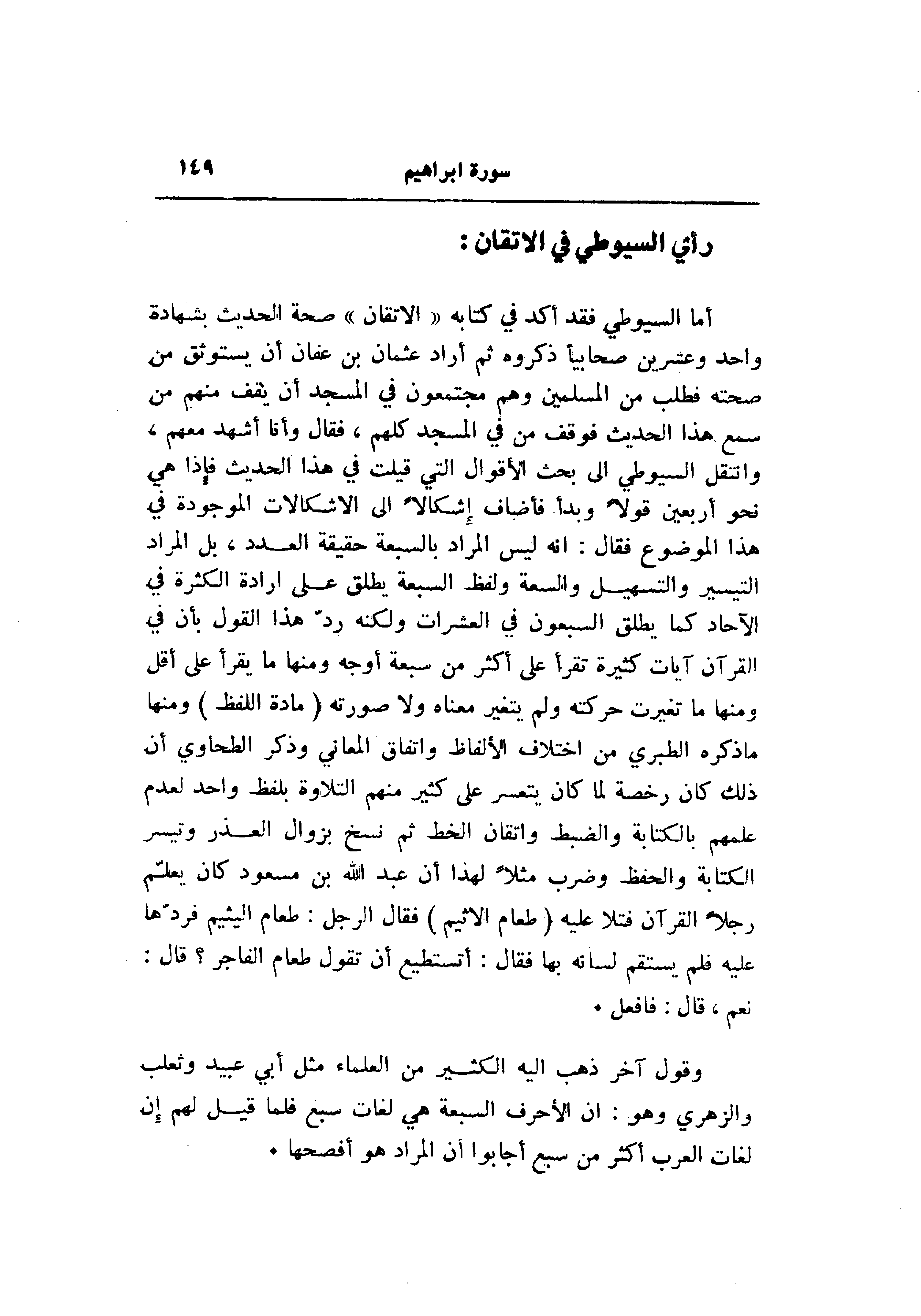 أما السيوطي فقد أكد في كتابه «الإتقان» صحة الحديث بشهادة واحد وعشرين صحابيا ذكروه ثم أراد عثمان بن عفان أن يستوثق من صحته فطلب من المسلمين وهم مجتمعون في المسجد أن يقف منهم من سمع هذا الحديث فوقف من في المسجد كلهم، فقال وأنا أشهد معهم، وانتقل السيوطي الى بحث الأقوال التي قيلت في هذا الحديث فإذا هي نحو أربعين قولا وبدأ فأضاف إشكالا الى الإشكالات الموجودة في هذا الموضوع فقال: انه ليس المراد بالسبعة حقيقة العدد، بل المراد التيسير والتسهيل والسعة ولفظ السبعة يطلق على ارادة الكثرة في الآحاد كما يطلق السبعون في العشرات ولكنه ردّ هذا القول بأن في القرآن آيات كثيرة تقرأ على أكثر من سبعة أوجه ومنها ما يقرأ على أقل ومنها ما تغيرت حركته ولم يتغير معناه ولا صورته (مادة اللفظ) ومنها ما ذكره الطبري من اختلاف الألفاظ واتفاق المعاني وذكر الطحاوي أن ذلك كان رخصة لما كان يتعسر على كثير منهم التلاوة بلفظ واحد لعدم علمهم بالكتابة والضبط وإتقان الخط ثم نسخ بزوال العذر وتيسر الكتابة والحفظ وضرب مثلا لهذا أن عبد الله بن مسعود كان يعلّم رجلا القرآن فتلا عليه (طَعامُ الْأَثِيمِ) فقال الرجل: طعام اليثيم فردّها عليه فلم يستقم لسانه بها فقال: أتستطيع أن تقول طعام الفاجر؟ قال: