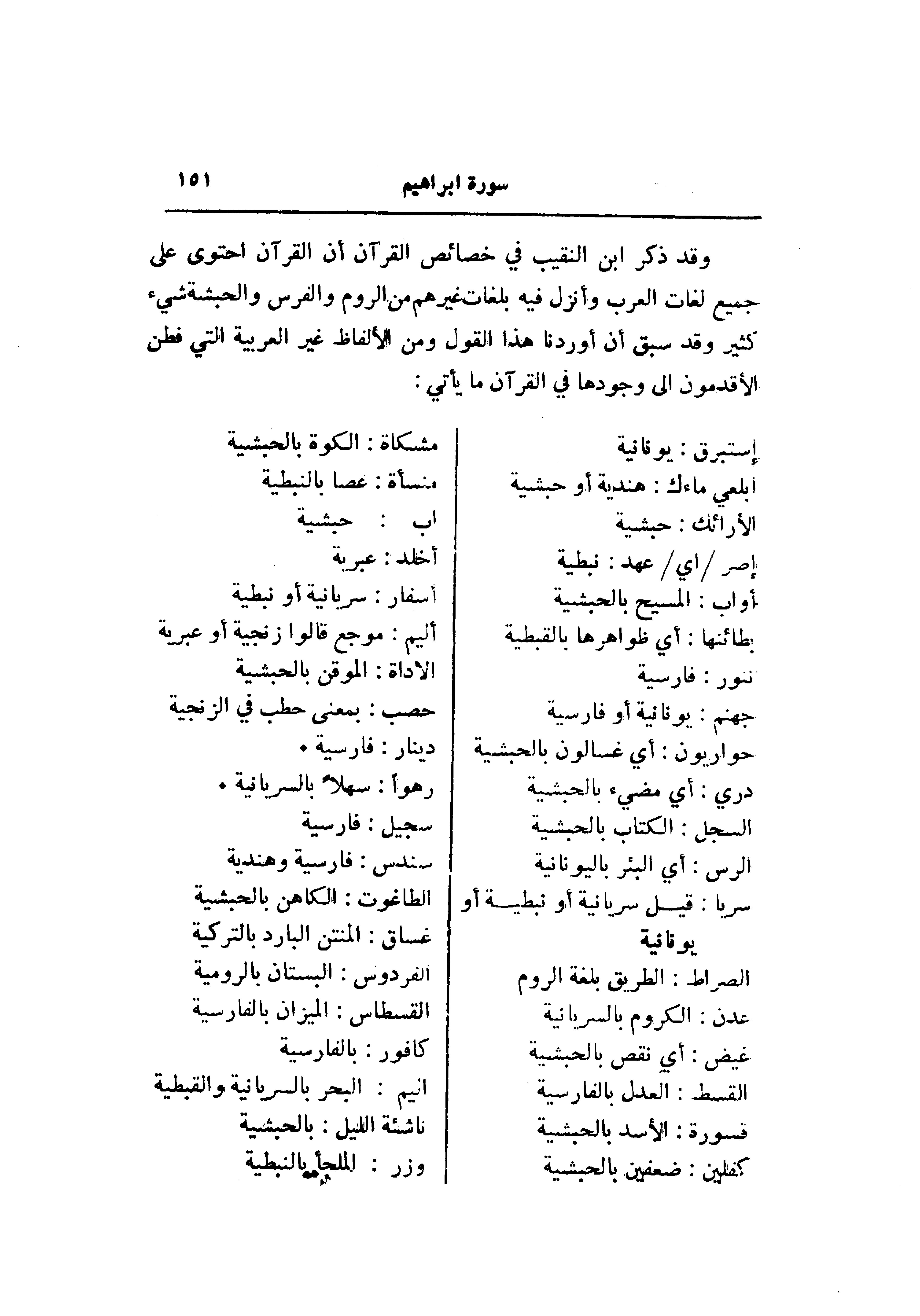 ل 1 إستبرق: يونانية ابلعي ماءك: هندية أو حبشية الأرائك: حبشية إصر/ اي/ عهد: نبطية أواب: المسيح بالحبشية بطائنها: أي ظواهرها بالقبطية تنور: فارسية جهنم: يونانية أو فارسية حواريون: أي غسالون بالحبشية دري: أي مضيء بالحبشية السجل: الكتاب بالحبشية الرس: أي البئر باليونانية سريا: قيل سريانية أو نبطية أو