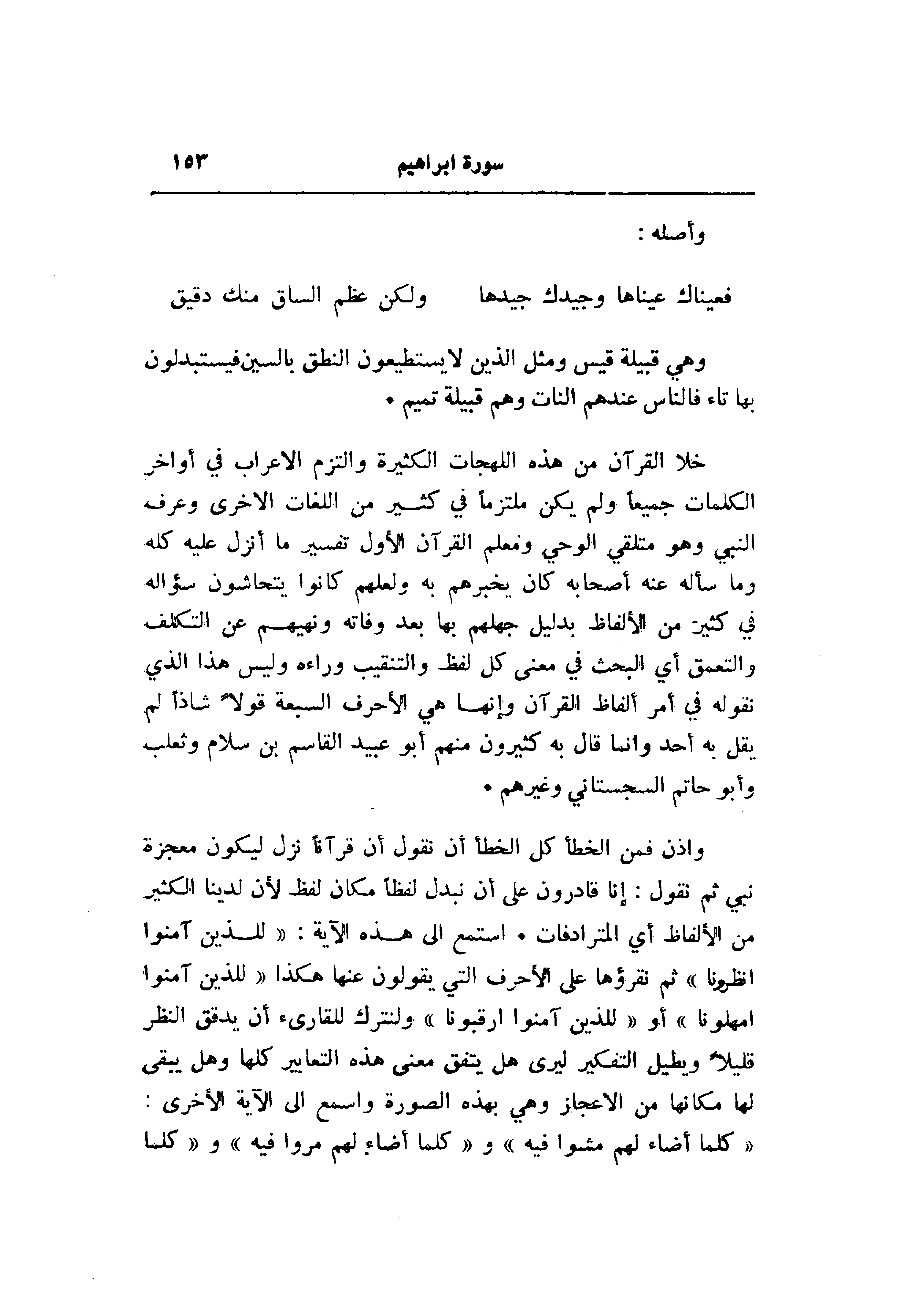 خلا القرآن من هذه اللهجات الكثيرة والتزم الاعراب في أواخر الكلمات جميعا ولم يكن ملتزما في كثير من اللغات الاخرى وعرف النبي وهو متلقي الوحي ومعلم القرآن الأول تفسير ما أنزل عليه كله وما سأله عنه أصحابه كان يخبرهم به ولعلهم كانوا يتحاشون سؤاله في كثير من الألفاظ بدليل جهلهم بها بعد وفاته ونهيهم عن التكلف والتعمق أي البحث في معنى كل لفظ والتنقيب وراءه وليس هذا الذي نقوله في أمر ألفاظ القرآن وإنها هي الأحرف السبعة قولا شاذا لم يقل به أحد وانما قال به كثيرون منهم أبو عبيد القاسم بن سلام وثعلب وأبو حاتم السجستاني وغيرهم.