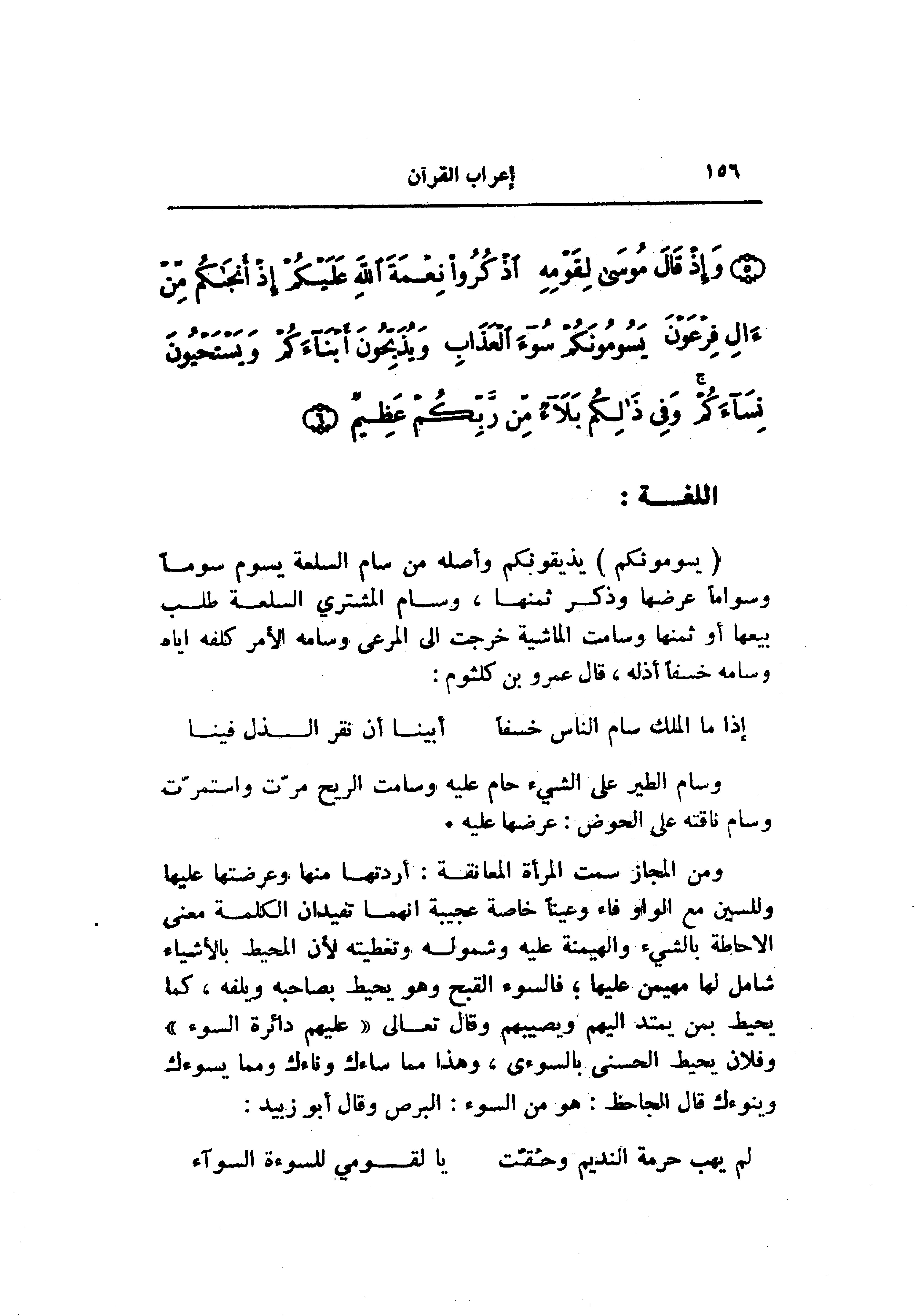 (يَسُومُونَكُمْ) يذيقونكم وأصله من سام السلعة يسوم سوما وسواما عرضها وذكر ثمنها، وسام المشتري السلعة طلب بيعها أو ثمنها وسامت الماشية خرجت الى المرعى وسامه الأمر كلفه إياه وسامه خسفا أذله، قال عمرو بن كلثوم: