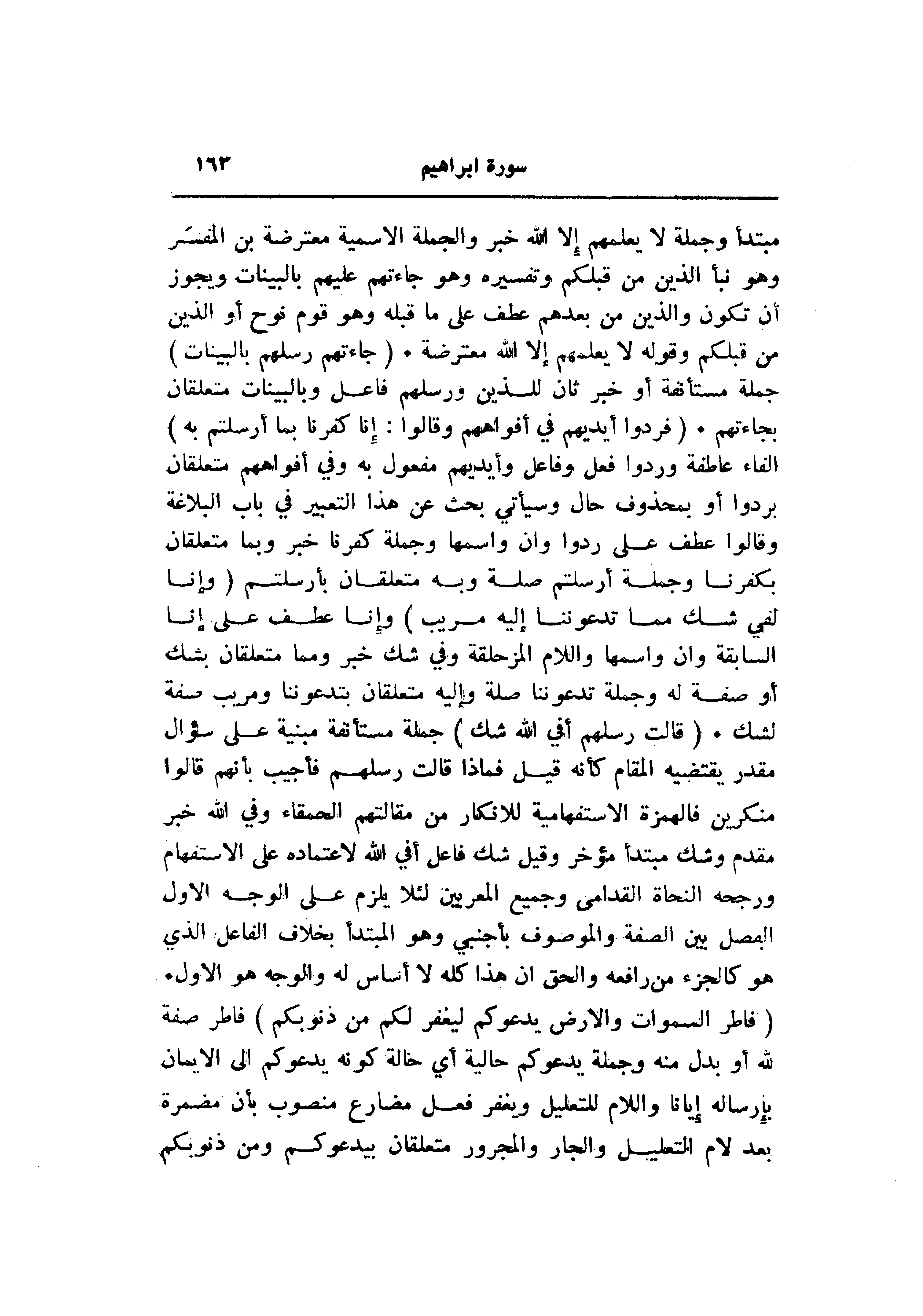 مبتدأ وجملة لا يعلمهم إلا الله خبر والجملة الاسمية معترضة بن المفسر وهو نبأ الذين من قبلكم وتفسيره وهو جاءتهم عليهم بالبينات ويجوز أن تكون والذين من بعدهم عطف على ما قبله وهو قوم نوح أو الذين من قبلكم وقوله لا يعلمهم إلا الله معترضة. (جاءَتْهُمْ رُسُلُهُمْ بِالْبَيِّناتِ) جملة مستأنفة أو خبر ثان للذين ورسلهم فاعل وبالبينات متعلقان بجاءتهم. (فَرَدُّوا أَيْدِيَهُمْ فِي أَفْواهِهِمْ وَقالُوا: إِنَّا كَفَرْنا بِما أُرْسِلْتُمْ بِهِ) الفاء عاطفة وردوا فعل وفاعل وأيديهم مفعول به وفي أفواههم متعلقان بردوا أو بمحذوف حال وسيأتي بحث عن هذا التعبير في باب البلاغة وقالوا عطف على ردوا وان واسمها وجملة كفرنا خبر وبما متعلقان بكفرنا وجملة أرسلتم صلة وبه متعلقان بأرسلتم (وَإِنَّا لَفِي شَكٍّ مِمَّا تَدْعُونَنا إِلَيْهِ مُرِيبٍ) وإنا عطف على إنا السابقة وان واسمها واللام المزحلقة وفي شك خبر ومما متعلقان بشك أو صفة له وجملة تدعوننا صلة وإليه متعلقان بتدعوننا ومريب صفة لشك. (قالَتْ رُسُلُهُمْ أَفِي اللَّهِ شَكٌّ) جملة مستأنفة مبنية على سؤال مقدر يقتضيه المقام كأنه قيل فماذا قالت رسلهم فأجيب بأنهم قالوا منكرين فالهمزة الاستفهامية للانكار من مقالتهم الحمقاء وفي الله خبر مقدم وشك مبتدأ مؤخر وقيل شك فاعل أفي الله لاعتماده على الاستفهام ورجحه النحاة القدامى وجميع المعربين لئلا يلزم على الوجه الاول الفصل بين الصفة والموصوف بأجنبي وهو المبتدأ بخلاف الفاعل الذي هو كالجزء من رافعه والحق ان هذا كله لا أساس له والوجه هو الاول.