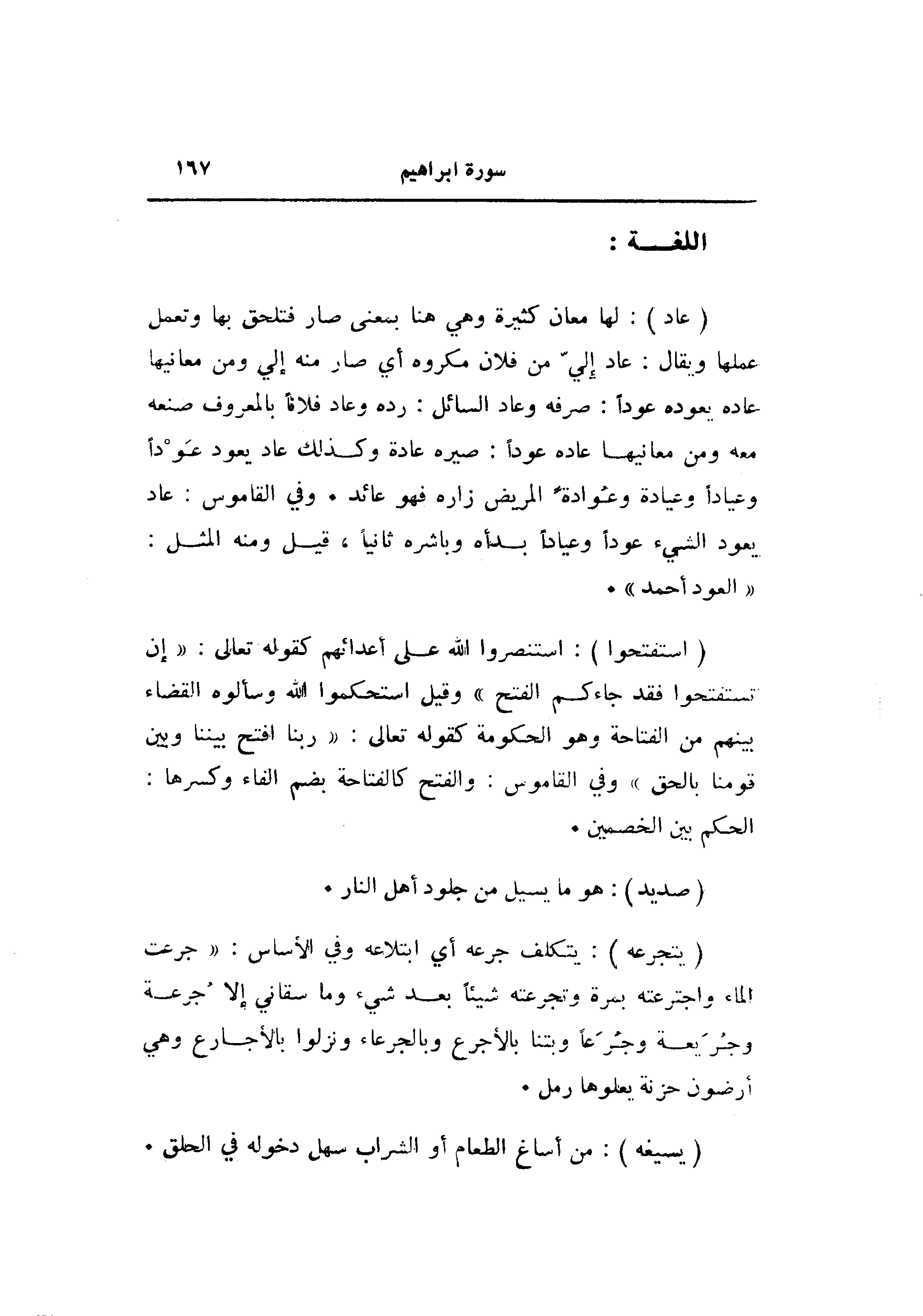 (يَتَجَرَّعُهُ) : يتكلف جرعه أي ابتلاعه وفي الأساس: «جرعت الماء واجترعته بمرة وتجرعته شيئا بعد شيء وما سقاني إلا جرعة وجريعة وجرعا وبتنا بالأجرع وبالجرعاء ونزلوا بالأجارع وهي أرضون حزنة يعلوها رمل.