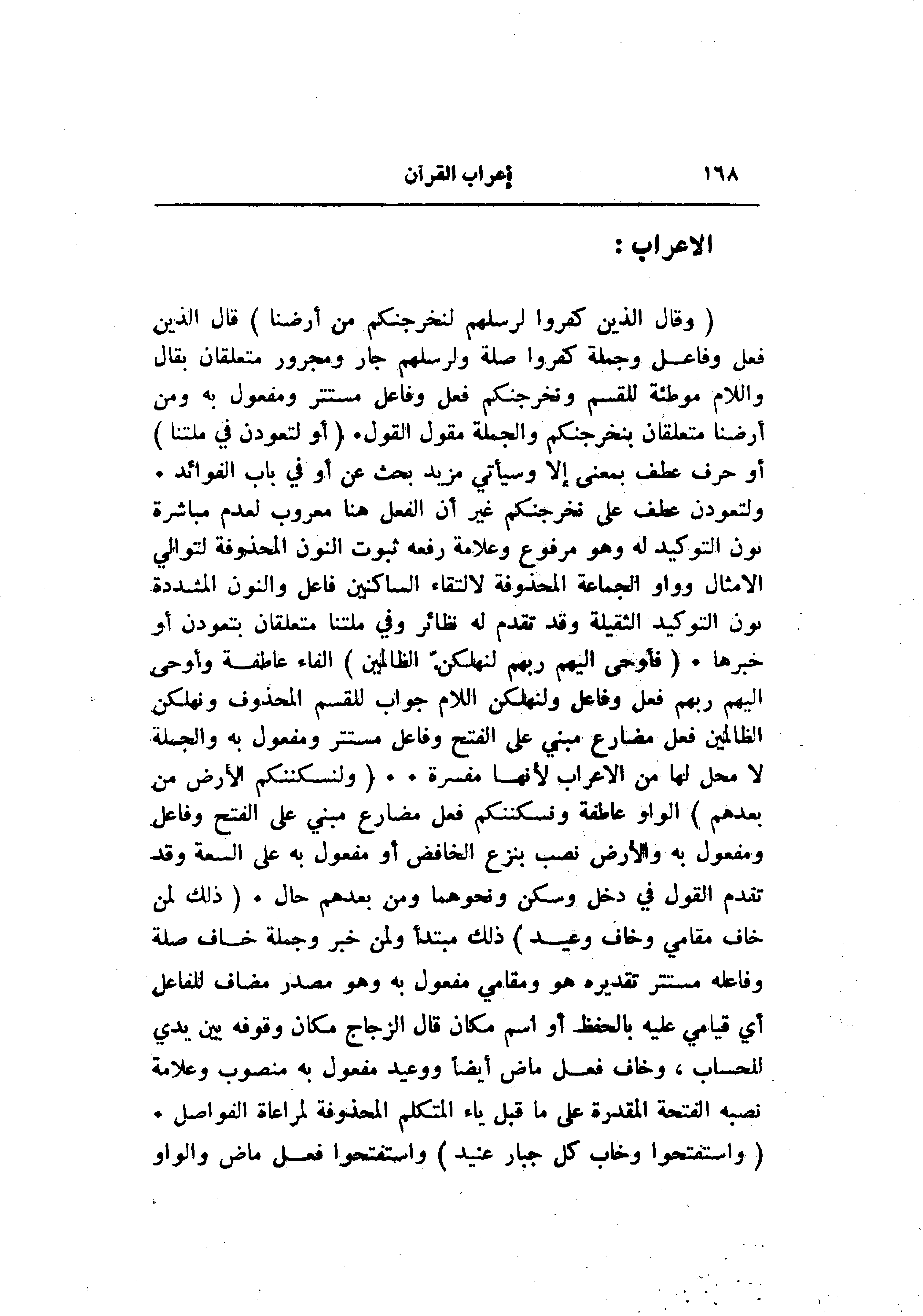 ولتعودن عطف على نخرجنكم غير أن الفعل هنا معروب لعدم مباشرة نون التوكيد له وهو مرفوع وعلامة رفعه ثبوت النون المحذوفة لتوالي الأمثال وواو الجماعة المحذوفة لالتقاء الساكنين فاعل والنون المشددة نون التوكيد الثقيلة وقد تقدم له نظائر وفي ملتنا متعلقان بتعودن أو خبرها. (فَأَوْحى إِلَيْهِمْ رَبُّهُمْ لَنُهْلِكَنَّ الظَّالِمِينَ) الفاء عاطفة وأوحى إليهم ربهم فعل وفاعل ولنهلكن اللام جواب للقسم المحذوف ونهلكن الظالمين فعل مضارع مبني على الفتح وفاعل مستتر ومفعول به والجملة لا محل لها من الإعراب لأنها مفسرة.. (وَلَنُسْكِنَنَّكُمُ الْأَرْضَ مِنْ بَعْدِهِمْ) الواو عاطفة ونسكننكم فعل مضارع مبني على الفتح وفاعل ومفعول به والأرض نصب بنزع الخافض أو مفعول به على السعة وقد تقدم القول في دخل وسكن ونحوهما ومن بعدهم حال. (ذلِكَ لِمَنْ خافَ مَقامِي وَخافَ وَعِيدِ) ذلك مبتدأ ولمن خبر وجملة خاف صلة وفاعله مستتر تقديره هو ومقامي مفعول به وهو مصدر مضاف للفاعل أي قيامي عليه بالحفظ أو اسم مكان قال الزجاج مكان وقوفه بين يدي للحساب، وخاف فعل ماض أيضا ووعيد مفعول به منصوب وعلامة نصبه الفتحة المقدرة على ما قبل ياء المتكلم المحذوفة لمراعاة الفواصل.