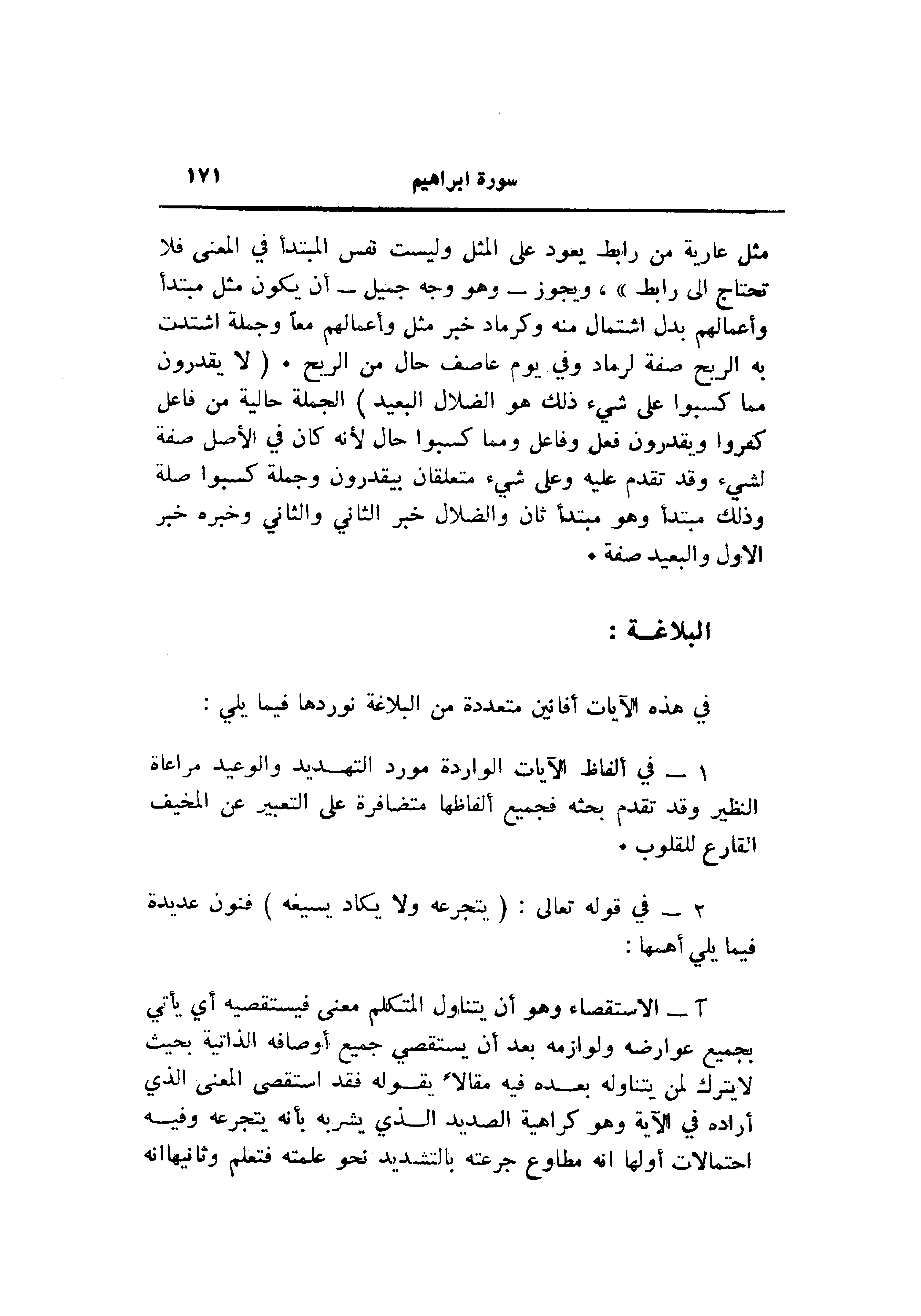 آ- الاستقصاء وهو أن يتناول المتكلم معنى فيستقصيه أي يأتي بجميع عوارضه ولوازمه بعد أن يستقصي جميع أوصافه الذاتية بحيث لا يترك لمن يتناوله بعده فيه مقالا يقوله فقد استقصى المعنى الذي أراده في الآية وهو كراهية الصديد الذي يشربه بأنه يتجرعه وفيه احتمالات أولها انه مطاوع جرعته بالتشديد نحو علمته فتعلم وثانيها انه