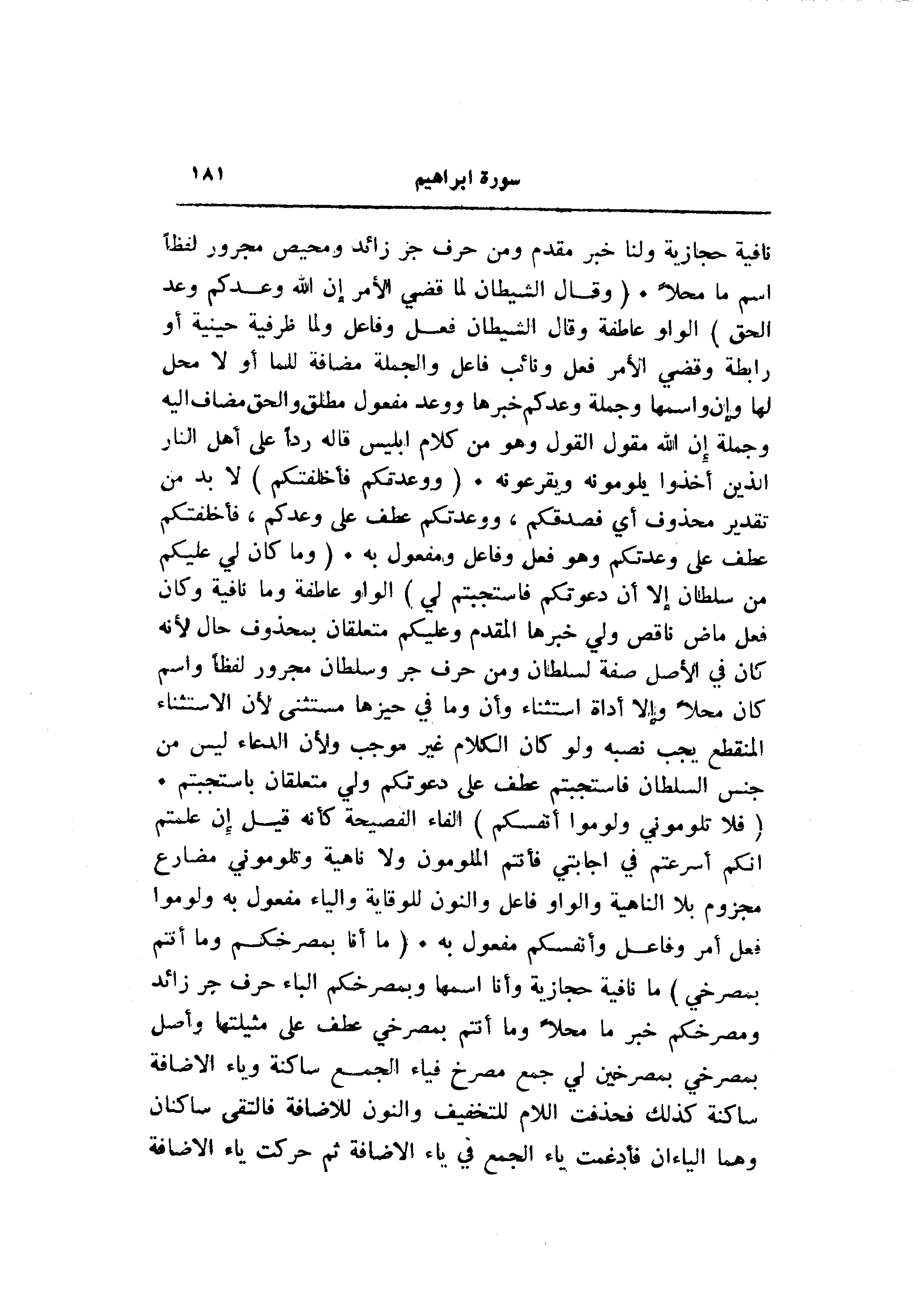 نافية حجازية ولنا خبر مقدم ومن حرف جر زائد ومحيص مجرور لفظا اسم ما محلا. (وَقالَ الشَّيْطانُ لَمَّا قُضِيَ الْأَمْرُ إِنَّ اللَّهَ وَعَدَكُمْ وَعْدَ الْحَقِّ) الواو عاطفة وقال الشيطان فعل وفاعل ولما ظرفية حينية أو رابطة وقضي الأمر فعل ونائب فاعل والجملة مضافة للما أو لا محل لها وإن واسمها وجملة وعدكم خبرها ووعد مفعول مطلق والحق مضاف اليه وجملة إن الله مقول القول وهو من كلام إبليس قاله ردا على أهل النار الذين أخذوا يلومونه ويقرعونه. (وَوَعَدْتُكُمْ فَأَخْلَفْتُكُمْ) لا بد من تقدير محذوف أي فصدقكم، ووعدتكم عطف على وعدكم، فأخلفتكم عطف على وعدتكم وهو فعل وفاعل ومفعول به. (وَما كانَ لِي عَلَيْكُمْ مِنْ سُلْطانٍ إِلَّا أَنْ دَعَوْتُكُمْ فَاسْتَجَبْتُمْ لِي) الواو عاطفة وما نافية وكان فعل ماض ناقص ولي خبرها المقدم وعليكم متعلقان بمحذوف حال لأنه كان في الأصل صفة لسلطان ومن حرف جر وسلطان مجرور لفظا واسم كان محلا وإلا أداة استثناء وأن وما في حيزها مستثنى لأن الاستثناء المنقطع يجب نصبه ولو كان الكلام غير موجب ولأن الدعاء ليس من جنس السلطان فاستجبتم عطف على دعوتكم ولي متعلقان باستجبتم.