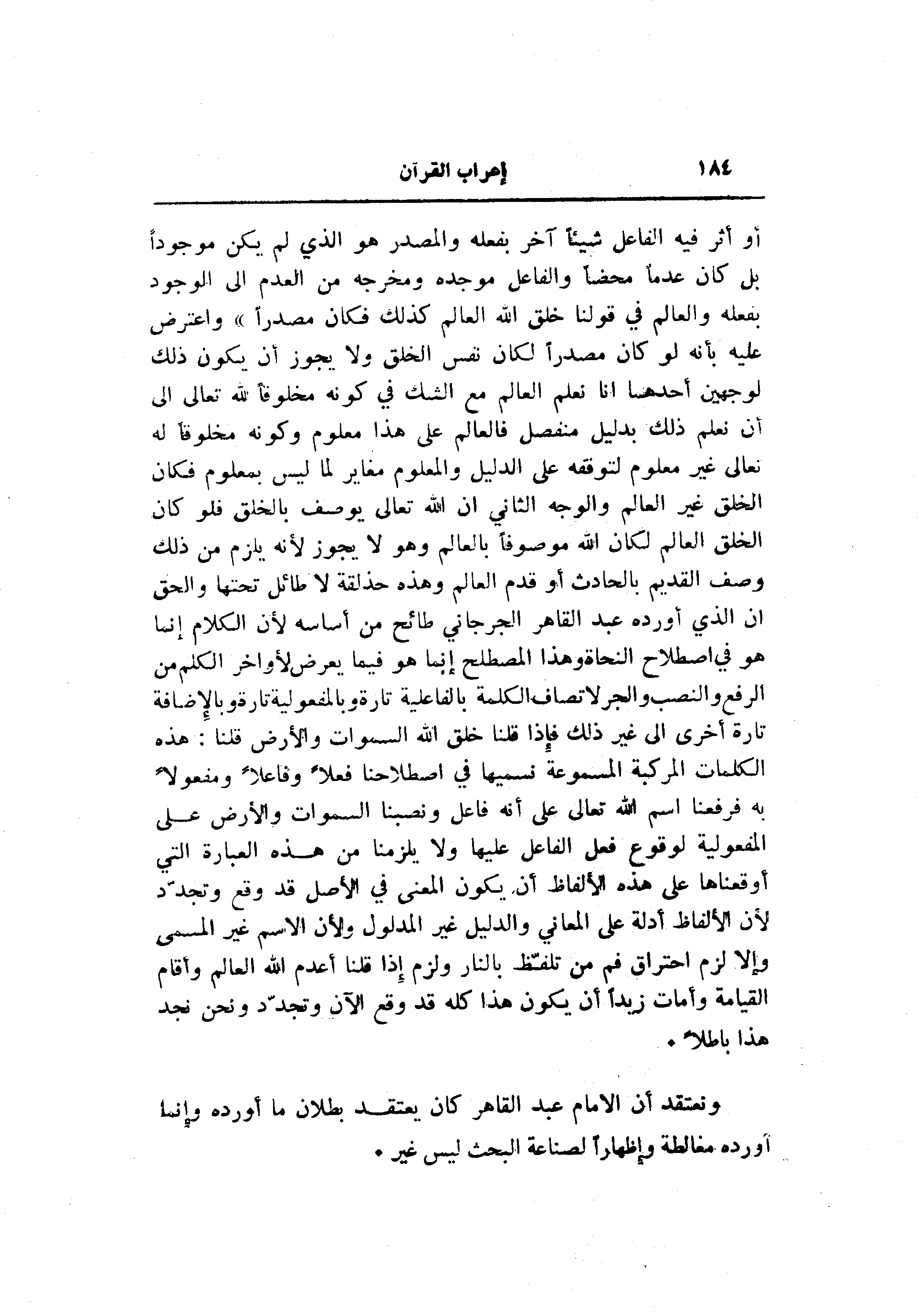 ونعتقد أن الامام عبد القاهر كان يعتقد بطلان ما أورده وإنما أورده مغالطة وإظهارا لصناعة البحث ليس غير.
