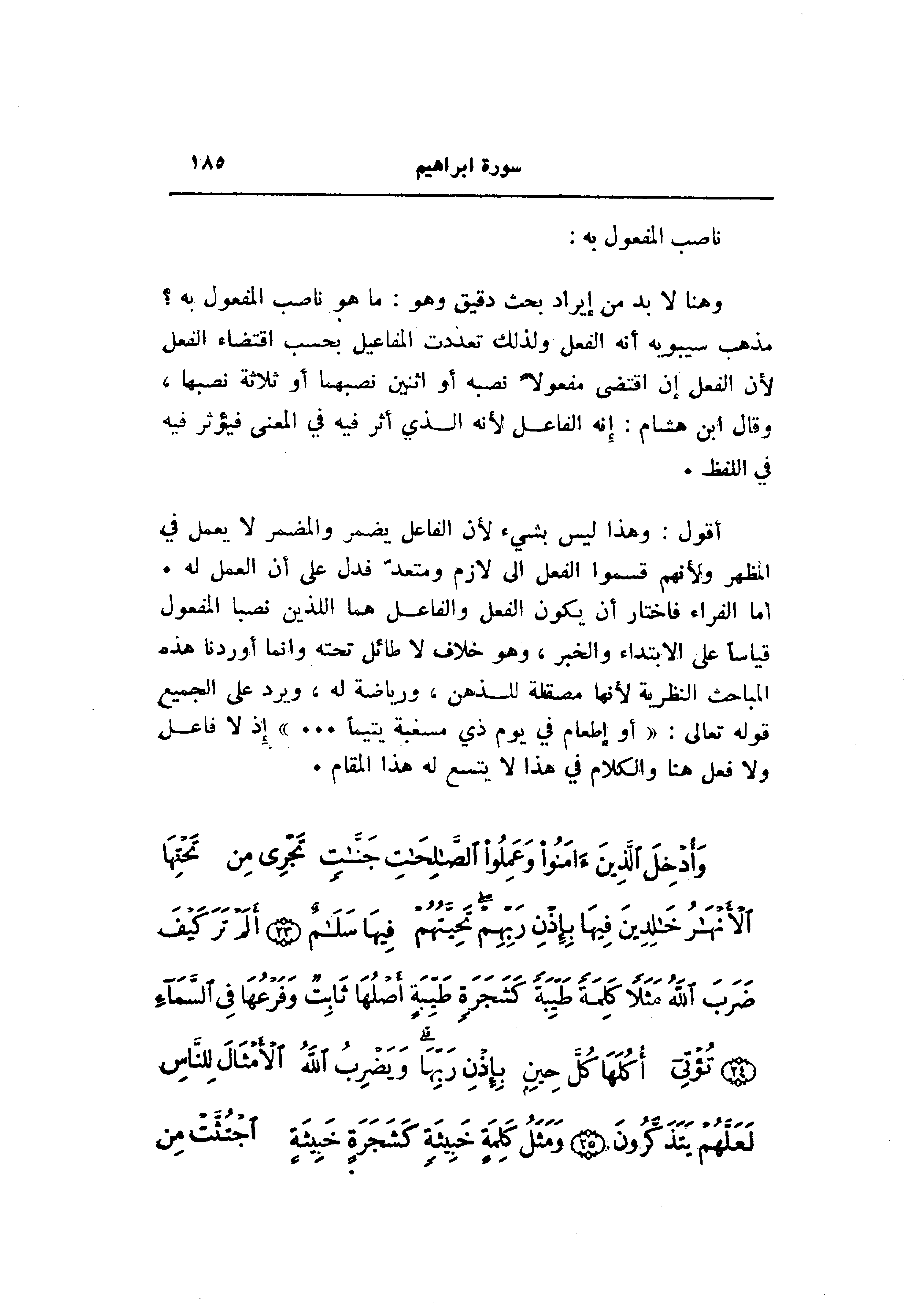 أما الفراء فاختار أن يكون الفعل والفاعل هما اللذين نصبا المفعول قياسا على الابتداء والخبر، وهو خلاف لا طائل تحته وانما أوردنا هذه المباحث النظرية لأنها مصقلة للذهن، ورياضة له، ويرد على الجميع قوله تعالى: «أو إطعام في يوم ذي مسغبة يتيما ... » إذ لا فاعل ولا فعل هنا والكلام في هذا لا يتسع له هذا المقام.
