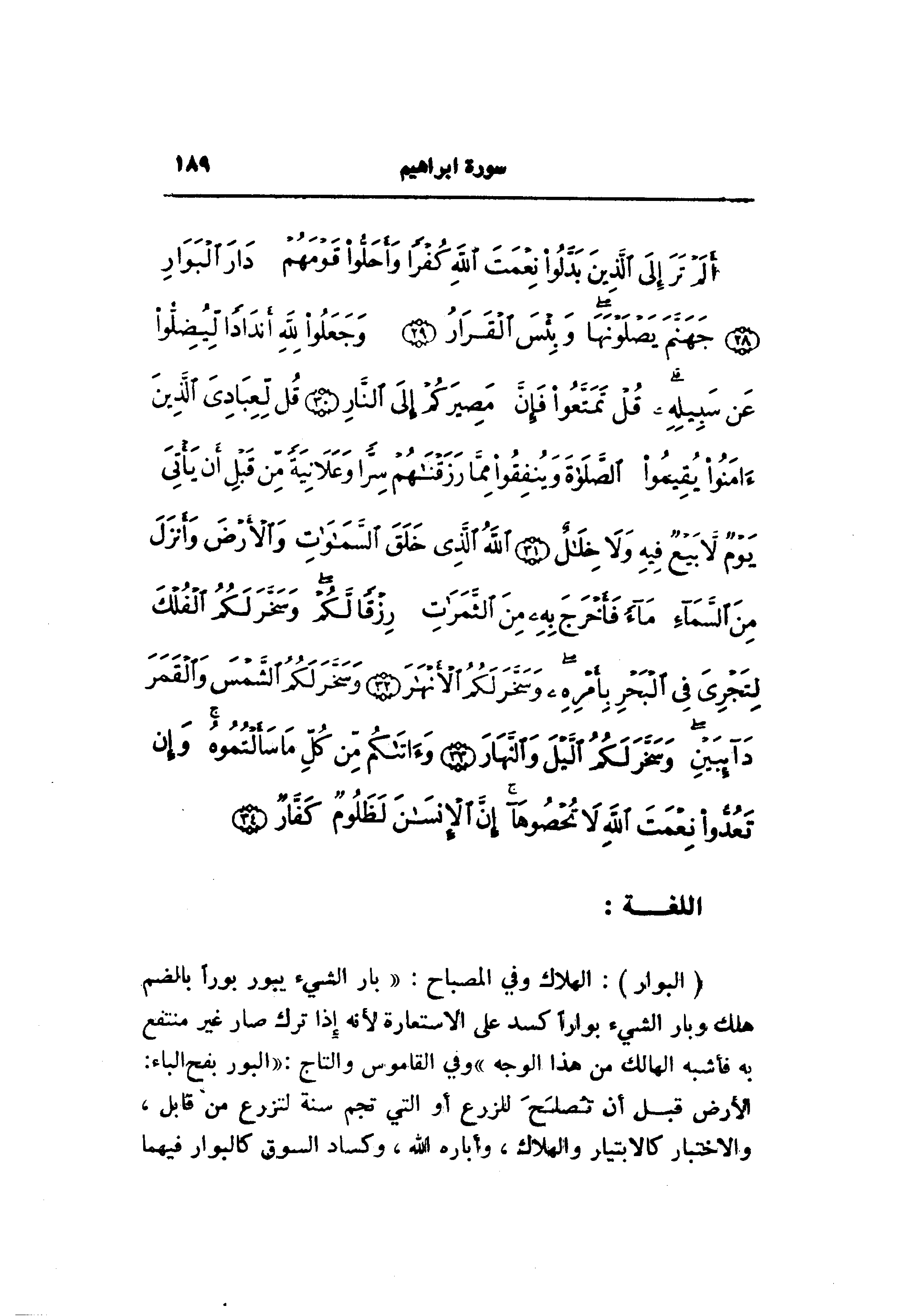 (الْبَوارِ) : الهلاك وفي المصباح: «بار الشيء يبور بورا بالضم هلك وبار الشيء بوارا كسد على الاستعارة لأنه إذا ترك صار غير منتفع به فأشبه الهالك من هذا الوجه» وفي القاموس والتاج: «البور بفتح الباء: