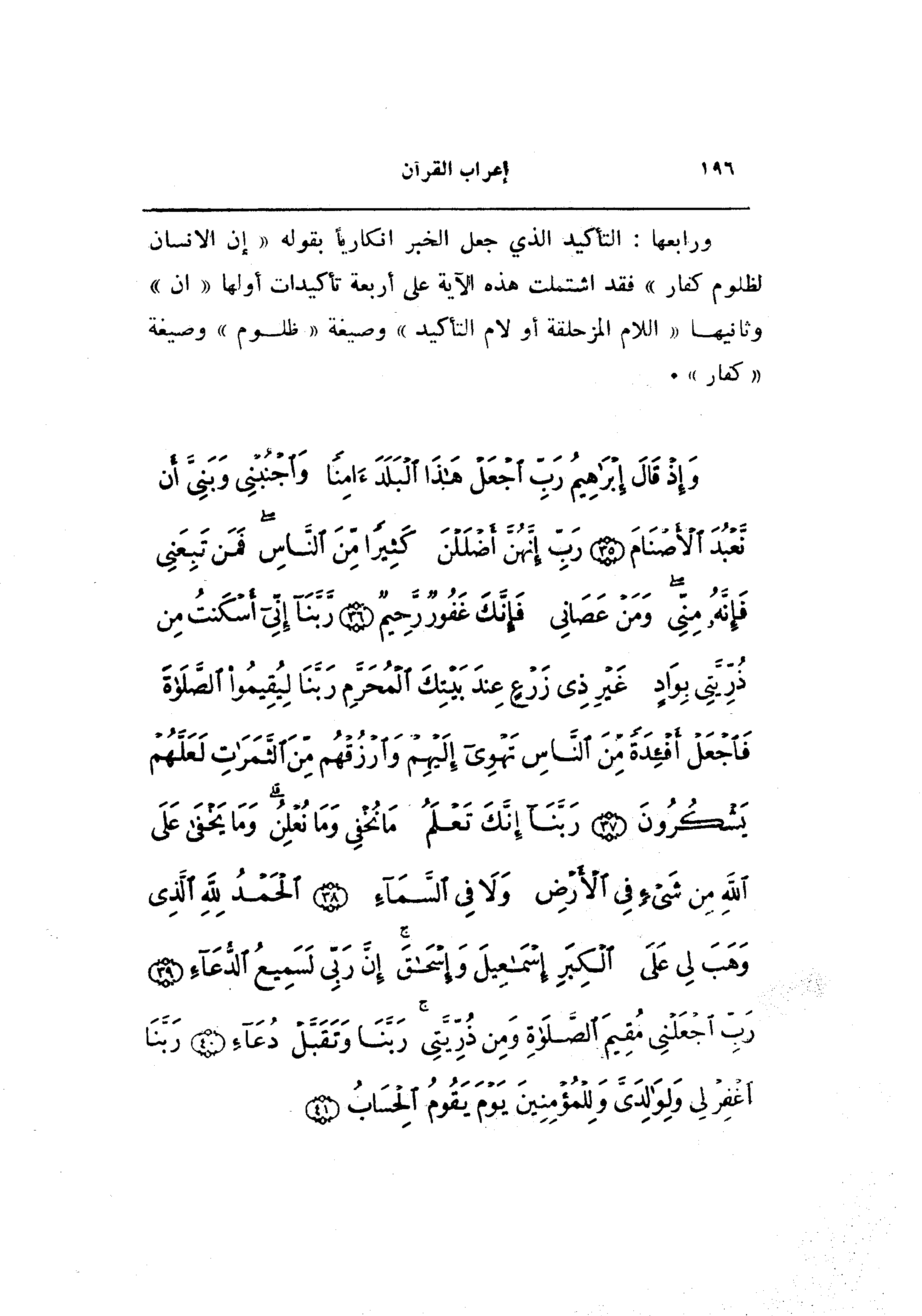 وَإِذْ قالَ إِبْراهِيمُ رَبِّ اجْعَلْ هَذَا الْبَلَدَ آمِناً وَاجْنُبْنِي وَبَنِيَّ أَنْ نَعْبُدَ الْأَصْنامَ (35) رَبِّ إِنَّهُنَّ أَضْلَلْنَ كَثِيراً مِنَ النَّاسِ فَمَنْ تَبِعَنِي فَإِنَّهُ مِنِّي وَمَنْ عَصانِي فَإِنَّكَ غَفُورٌ رَحِيمٌ (36) رَبَّنا إِنِّي أَسْكَنْتُ مِنْ ذُرِّيَّتِي بِوادٍ غَيْرِ ذِي زَرْعٍ عِنْدَ بَيْتِكَ الْمُحَرَّمِ رَبَّنا لِيُقِيمُوا الصَّلاةَ فَاجْعَلْ أَفْئِدَةً مِنَ النَّاسِ تَهْوِي إِلَيْهِمْ وَارْزُقْهُمْ مِنَ الثَّمَراتِ لَعَلَّهُمْ يَشْكُرُونَ (37) رَبَّنا إِنَّكَ تَعْلَمُ ما نُخْفِي وَما نُعْلِنُ وَما يَخْفى عَلَى اللَّهِ مِنْ شَيْءٍ فِي الْأَرْضِ وَلا فِي السَّماءِ (38) الْحَمْدُ لِلَّهِ الَّذِي وَهَبَ لِي عَلَى الْكِبَرِ إِسْماعِيلَ وَإِسْحاقَ إِنَّ رَبِّي لَسَمِيعُ الدُّعاءِ (39)