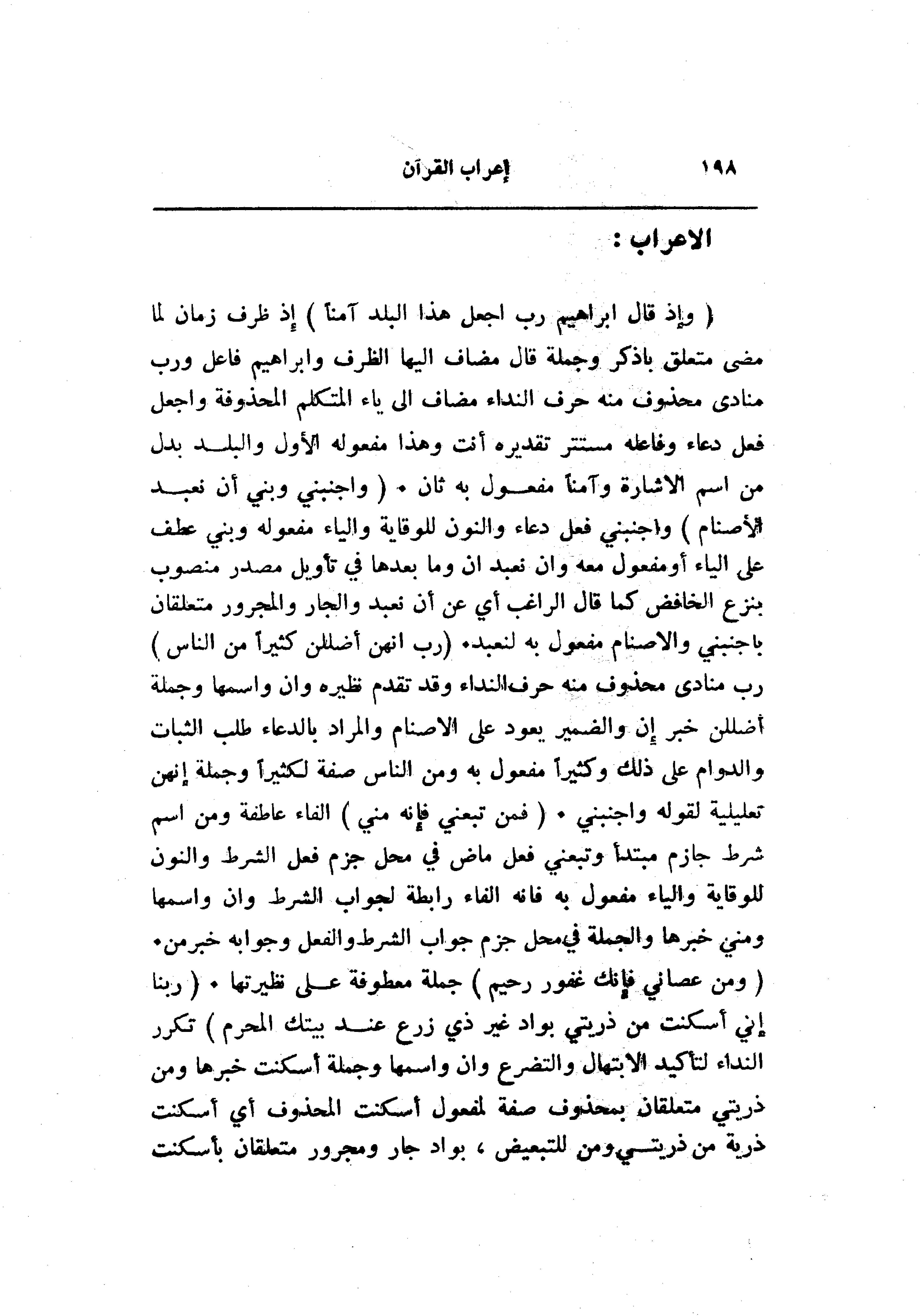(وَإِذْ قالَ إِبْراهِيمُ رَبِّ اجْعَلْ هَذَا الْبَلَدَ آمِناً) إذ ظرف زمان لما مضى متعلق باذكر وجملة قال مضاف إليها الظرف وابراهيم فاعل ورب منادى محذوف منه حرف النداء مضاف الى ياء المتكلم المحذوفة واجعل فعل دعاء وفاعله مستتر تقديره أنت وهذا مفعوله الأول والبلد بدل من اسم الاشارة وآمنا مفعول به ثان. (وَاجْنُبْنِي وَبَنِيَّ أَنْ نَعْبُدَ الْأَصْنامَ) واجنبني فعل دعاء والنون للوقاية والياء مفعوله وبني عطف على الياء أو مفعول معه وان نعبد ان وما بعدها في تأويل مصدر منصوب بنزع الخافض كما قال الراغب أي عن أن نعبد والجار والمجرور متعلقان باجنبني والأصنام مفعول به لنعبد. (رَبِّ إِنَّهُنَّ أَضْلَلْنَ كَثِيراً مِنَ النَّاسِ) رب منادى محذوف منه حرف النداء وقد تقدم نظيره وان واسمها وجملة أضللن خبر إن والضمير يعود على الأصنام والمراد بالدعاء طلب الثبات والدوام على ذلك وكثيرا مفعول به ومن الناس صفة لكثيرا وجملة إنهن تعليلية لقوله واجنبني. (فَمَنْ تَبِعَنِي فَإِنَّهُ مِنِّي) الفاء عاطفة ومن اسم شرط جازم مبتدأ وتبعني فعل ماض في محل جزم فعل الشرط والنون للوقاية والياء مفعول به فانه الفاء رابطة لجواب الشرط وان واسمها ومني خبرها والجملة في محل جزم جواب الشرط والفعل وجوابه خبر من.