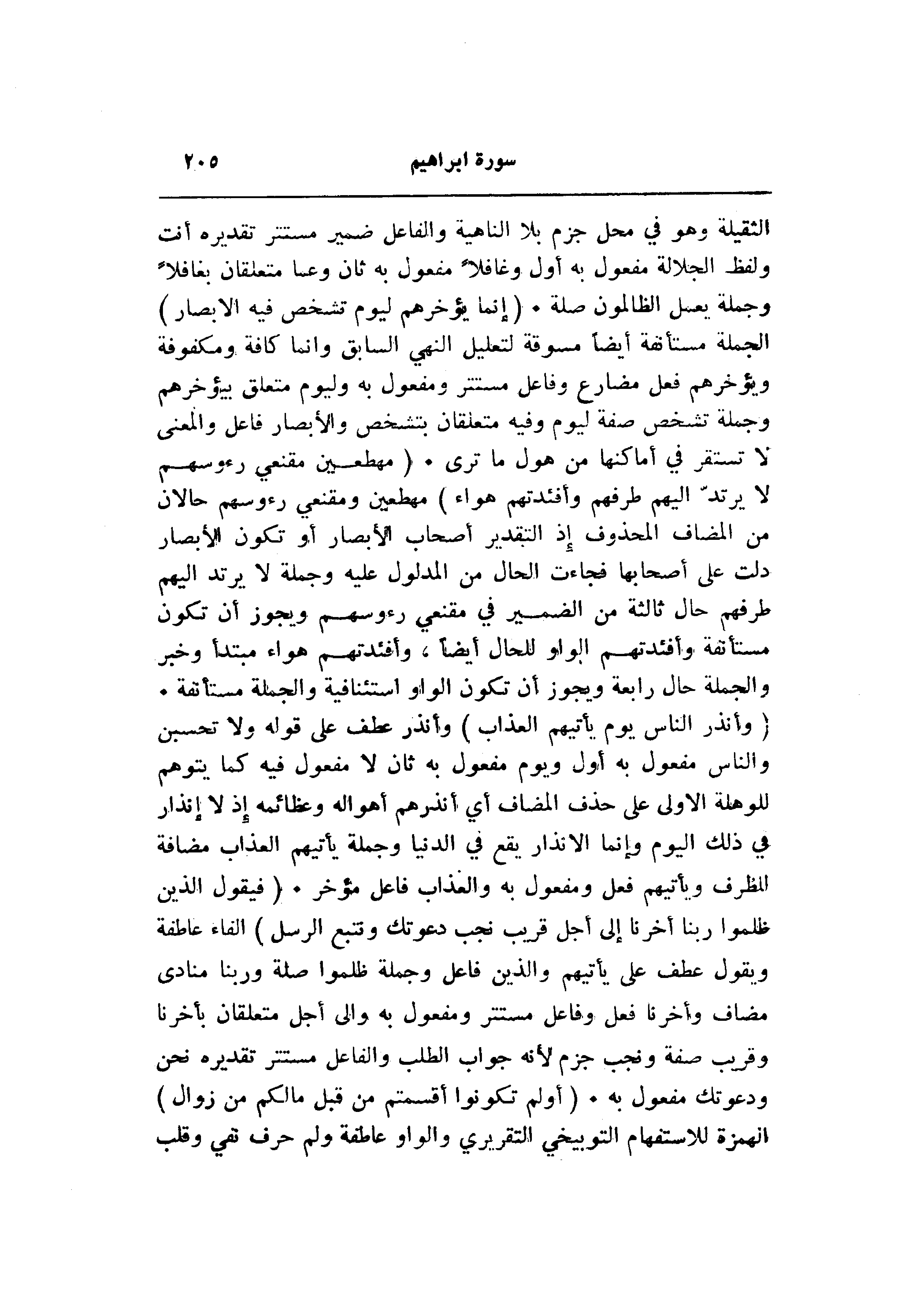 الثقيلة وهو في محل جزم بلا الناهية والفاعل ضمير مستتر تقديره أنت ولفظ الجلالة مفعول به أول وغافلا مفعول به ثان وعما متعلقان بغافلا وجملة يعمل الظالمون صلة. (إِنَّما يُؤَخِّرُهُمْ لِيَوْمٍ تَشْخَصُ فِيهِ الْأَبْصارُ) الجملة مستأنفة أيضا مسوقة لتعليل النهي السابق وانما كافة ومكفوفة ويؤخرهم فعل مضارع وفاعل مستتر ومفعول به وليوم متعلق بيؤخرهم وجملة تشخص صفة ليوم وفيه متعلقان بتشخص والأبصار فاعل والمعنى لا تستقر في أماكنها من هول ما ترى. (مُهْطِعِينَ مُقْنِعِي رُؤُسِهِمْ لا يَرْتَدُّ إِلَيْهِمْ طَرْفُهُمْ وَأَفْئِدَتُهُمْ هَواءٌ) مهطعين ومقنعي رءوسهم حالان من المضاف المحذوف إذ التقدير أصحاب الأبصار أو تكون الأبصار دلت على أصحابها فجاءت الحال من المدلول عليه وجملة لا يرتد إليهم طرفهم حال ثالثة من الضمير في مقنعي رءوسهم ويجوز أن تكون مستأنفة وأفئدتهم الواو للحال أيضا، وأفئدتهم هواء مبتدأ وخبر والجملة حال رابعة ويجوز أن تكون الواو استئنافية والجملة مستأنفة.