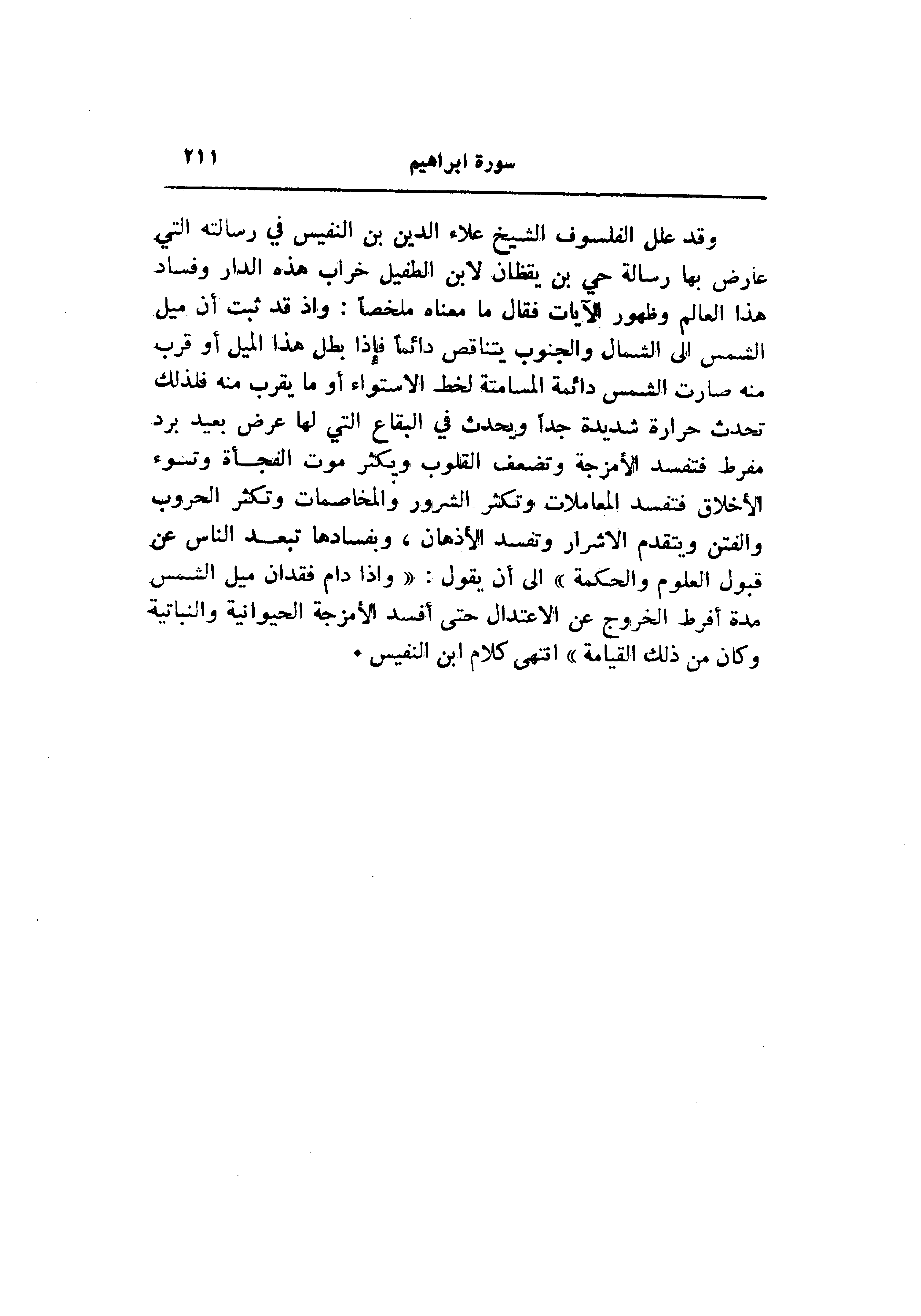 وقد علل الفيلسوف الشيخ علاء الدين بن النفيس في رسالته التي عارض بها رسالة حي بن يقظان لا بن الطفيل خراب هذه الدار وفساد هذا العالم وظهور الآيات فقال ما معناه ملخصا: وإذ قد ثبت أن ميل الشمس الى الشمال والجنوب يتناقص دائما فإذا بطل هذا الميل أو قرب منه صارت الشمس دائمة المسامتة لخط الاستواء أو ما يقرب منه فلذلك تحدث حرارة شديدة جدا ويحدث في البقاع التي لها عرض بعيد برد مفرط فتفسد الأمزجة وتضعف القلوب ويكثر موت الفجأة وتسوء الأخلاق فتفسد المعاملات وتكثر الشرور والمخاصمات وتكثر الحروب والفتن ويتقدم الأشرار وتفسد الأذهان، وبفسادها تبعد الناس عن قبول العلوم والحكمة» الى أن يقول: «وإذا دام فقدان ميل الشمس مدة أفرط الخروج عن الاعتدال حتى أفسد الأمزجة الحيوانية والنباتية وكان من ذلك القيامة» انتهى كلام ابن النفيس.