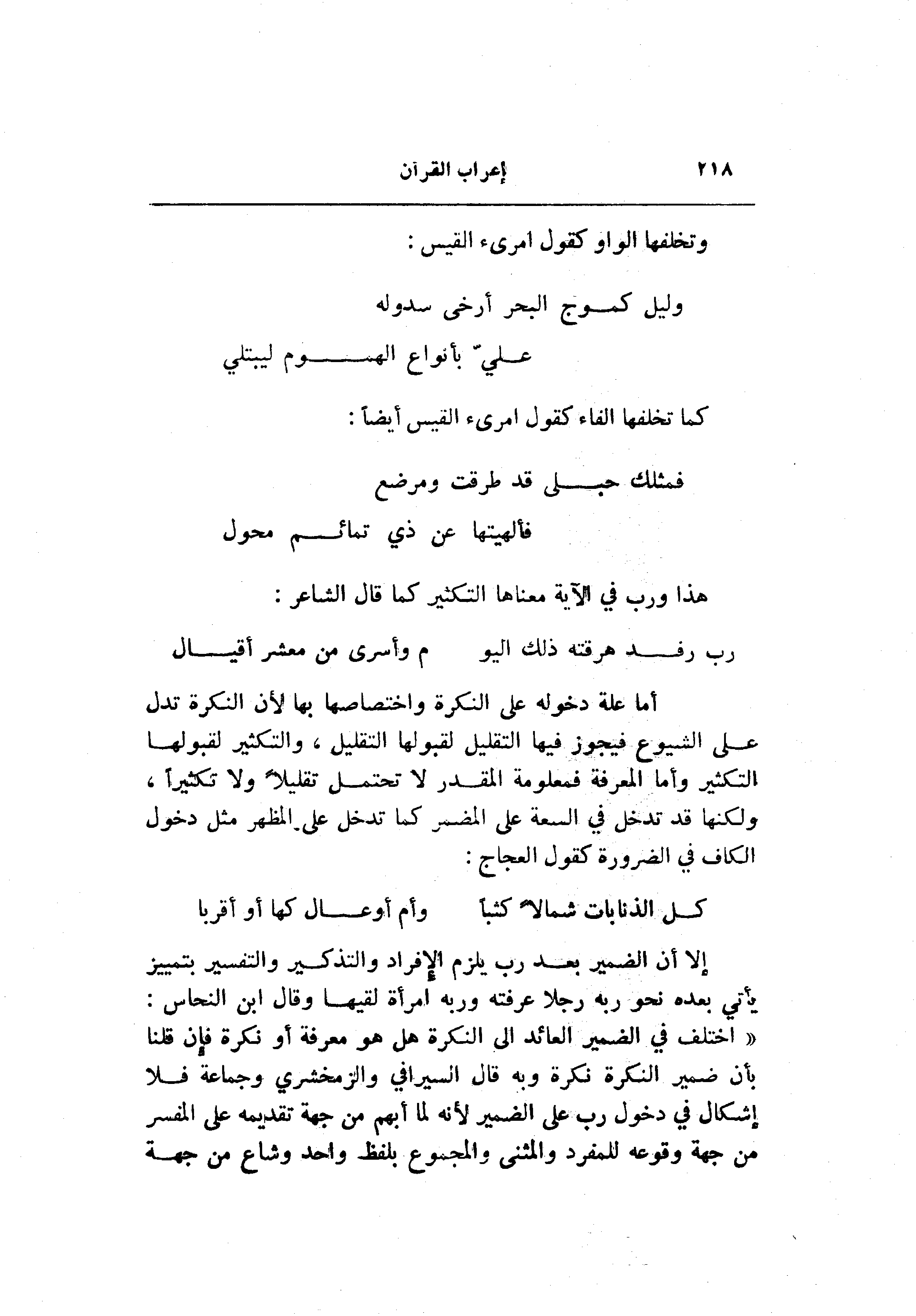«اختلف في الضمير العائد الى النكرة هل هو معرفة أو نكرة فإن قلنا بأن ضمير النكرة نكرة وبه قال السيرافي والزمخشري وجماعة فلا إشكال في دخول رب على الضمير لأنه لما أبهم من جهة تقديمه على المفسر من جهة وقوعه للمفرد والمثنى والمجموع بلفظ واحد وشاع من جهة