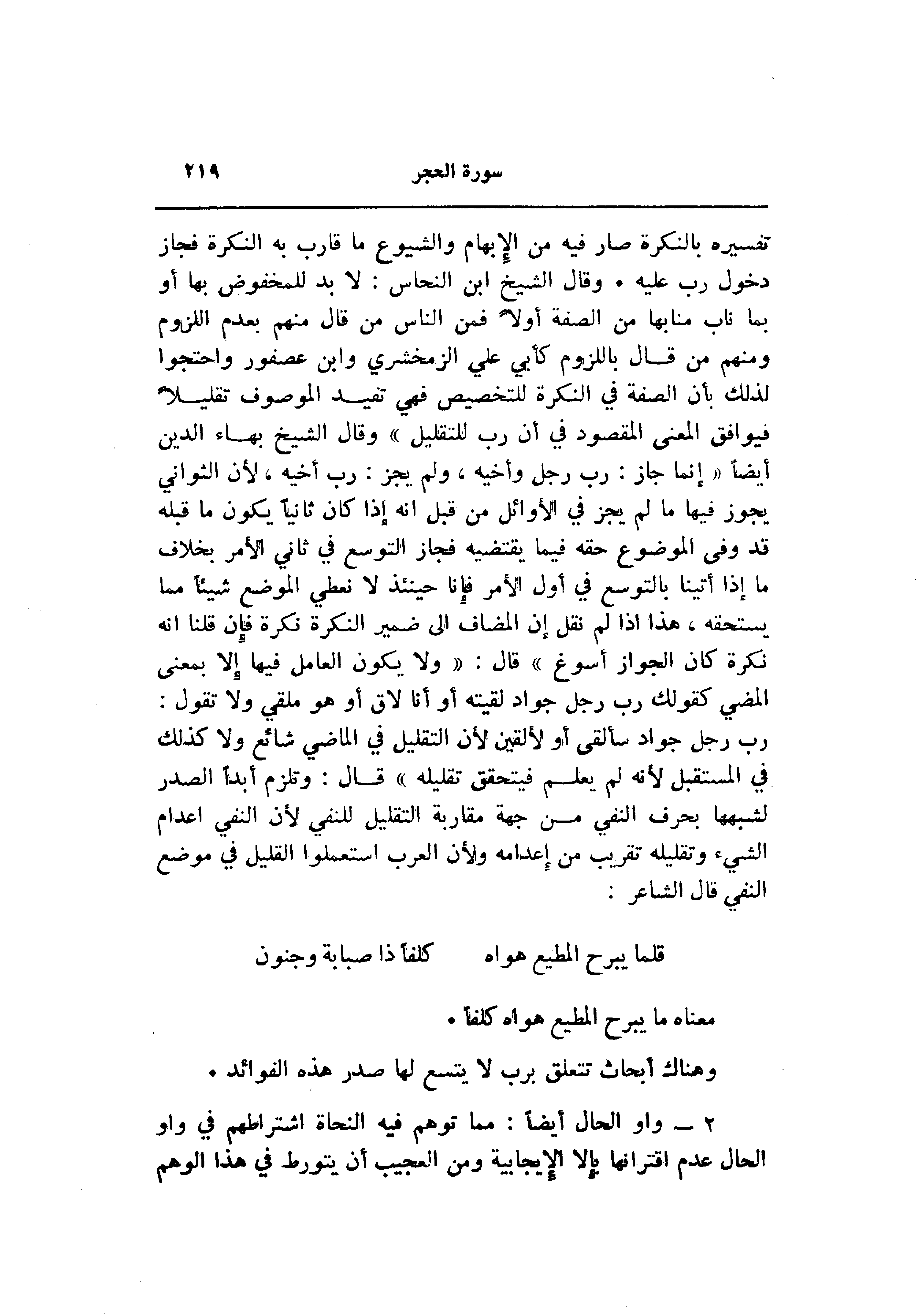 تفسيره بالنكرة صار فيه من الإبهام والشيوع ما قارب به النكرة فجاز دخول رب عليه. وقال الشيخ ابن النحاس: لا بد للمخفوض بها أو بما ناب منابها من الصفة أولا فمن الناس من قال منهم بعدم اللزوم ومنهم من قال باللزوم كأبي علي الزمخشري وابن عصفور واحتجوا لذلك بأن الصفة في النكرة للتخصيص فهي تفيد الموصوف تقليلا فيوافق المعنى المقصود في أن رب للتقليل» وقال الشيخ بهاء الدين أيضا «إنما جاز: رب رجل وأخيه، ولم يجز: رب أخيه، لأن الثواني يجوز فيها ما لم يجز في الأوائل من قبل انه إذا كان ثانيا يكون ما قبله قد وفى الموضوع حقه فيما يقتضيه فجاز التوسع في ثاني الأمر بخلاف ما إذا أتينا بالتوسع في أول الأمر فإنا حينئذ لا نعطي الموضع شيئا مما يستحقه، هذا إذا لم نقل إن المضاف الى ضمير النكرة نكرة فإن قلنا انه نكرة كان الجواز أسوغ» قال: «ولا يكون العامل فيها إلا بمعنى المضي كقولك رب رجل جواد لقيته أو أنا لاق أو هو ملقي ولا تقول: