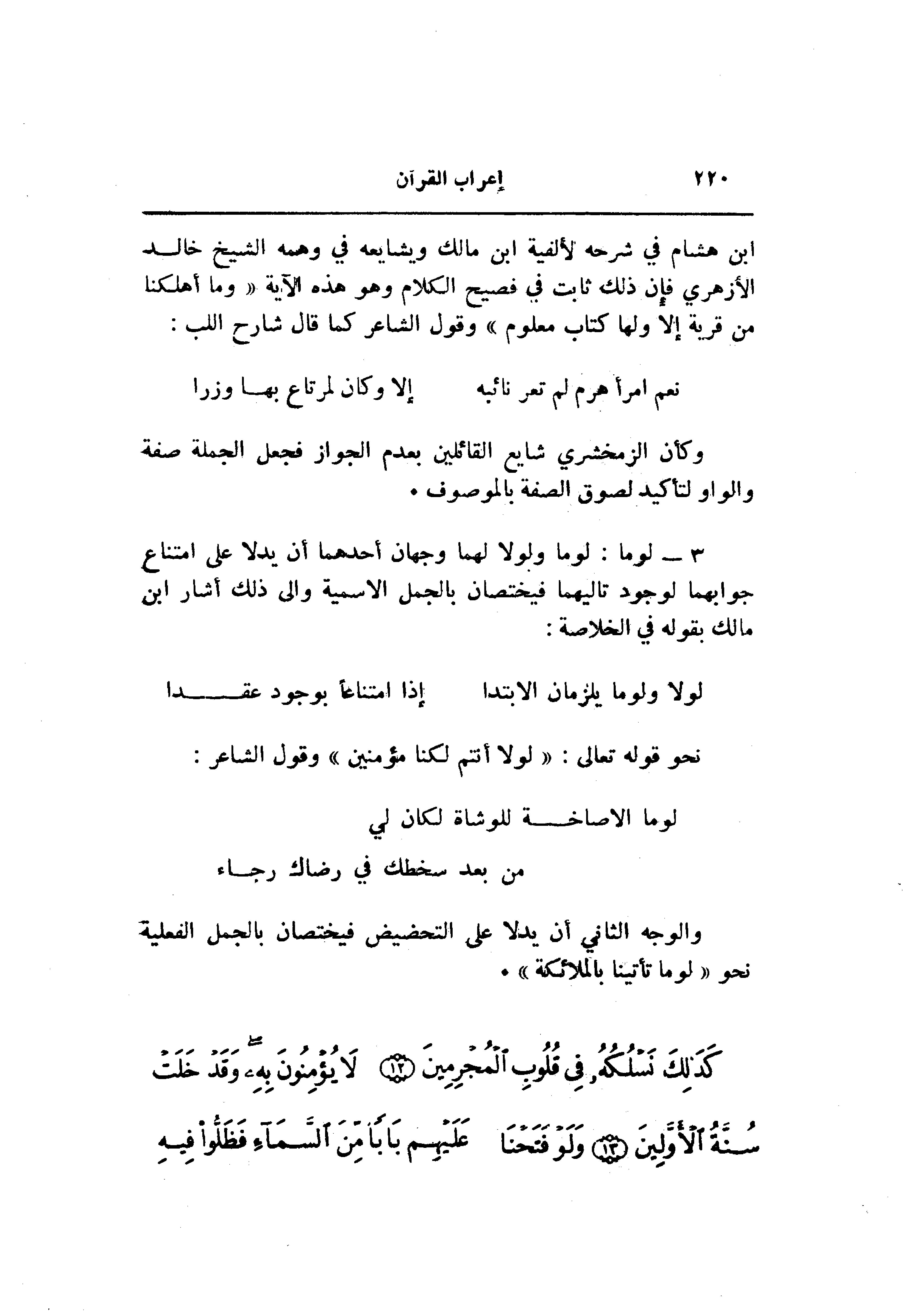 ابن هشام في شرحه لألفية ابن مالك ويشايعه في وهمه الشيخ خالد الأزهري فإن ذلك ثابت في فصيح الكلام وهو هذه الآية «وما أهلكنا من قرية إلا ولها كتاب معلوم» وقول الشاعر كما قال شارح اللب: