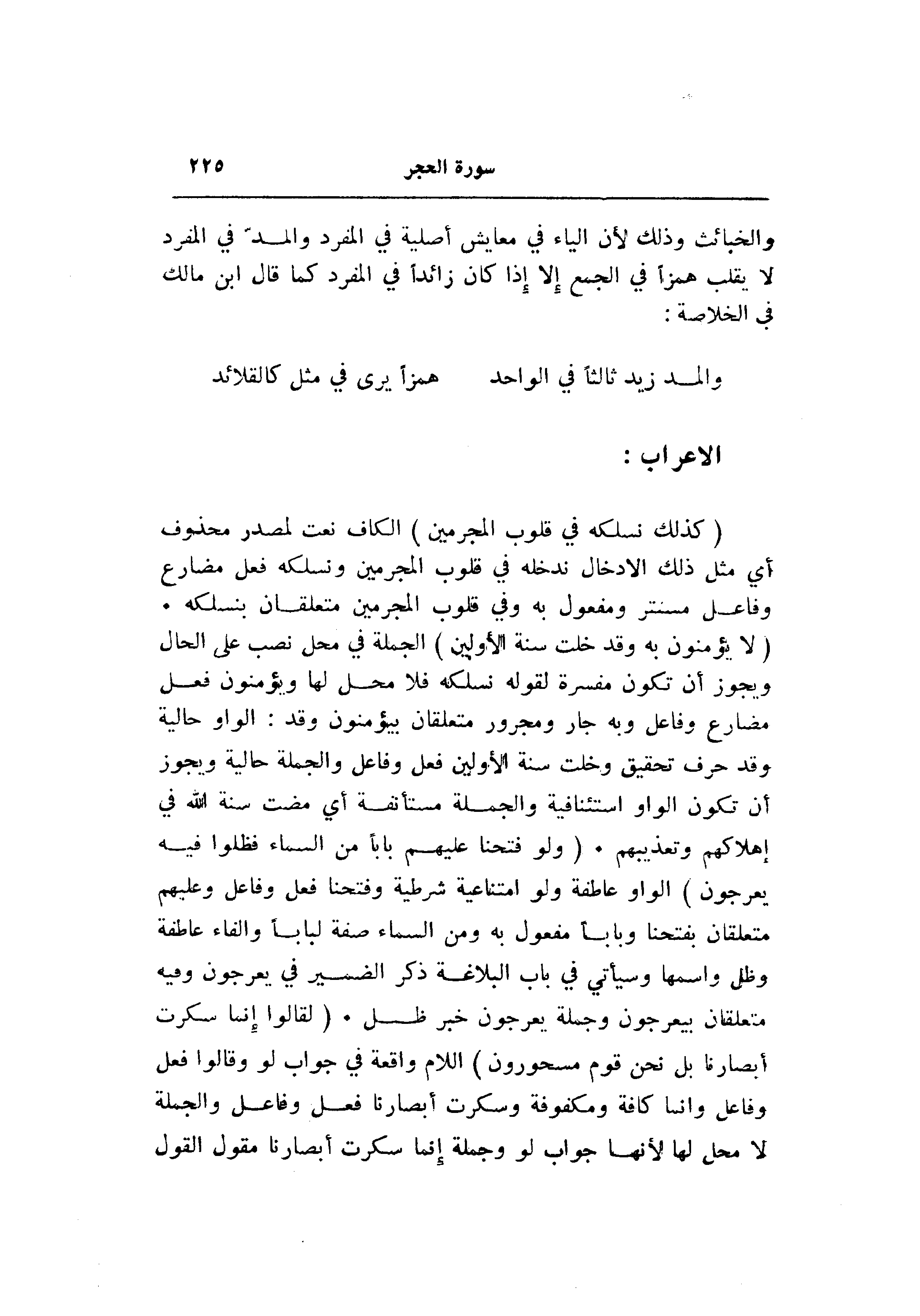 (لا يُؤْمِنُونَ بِهِ وَقَدْ خَلَتْ سُنَّةُ الْأَوَّلِينَ) الجملة في محل نصب على الحال ويجوز أن تكون مفسرة لقوله نسلكه فلا محل لها ويؤمنون فعل مضارع وفاعل وبه جار ومجرور متعلقان بيؤمنون وقد: الواو حالية وقد حرف تحقيق وخلت سنة الأولين فعل وفاعل والجملة حالية ويجوز أن تكون الواو استئنافية والجملة مستأنفة أي مضت سنة الله في إهلاكهم وتعذيبهم. (وَلَوْ فَتَحْنا عَلَيْهِمْ باباً مِنَ السَّماءِ فَظَلُّوا فِيهِ يَعْرُجُونَ) الواو عاطفة ولو امتناعية شرطية وفتحنا فعل وفاعل وعليهم متعلقان بفتحنا وبابا مفعول به ومن السماء صفة لبابا والفاء عاطفة وظل واسمها وسيأتي في باب البلاغة ذكر الضمير في يعرجون وفيه متعلقان بيعرجون وجملة يعرجون خبر ظل. (لَقالُوا إِنَّما سُكِّرَتْ أَبْصارُنا بَلْ نَحْنُ قَوْمٌ مَسْحُورُونَ) اللام واقعة في جواب لو وقالوا فعل وفاعل وانما كافة ومكفوفة وسكرت أبصارنا فعل وفاعل والجملة لا محل لها لأنها جواب لو وجملة إنما سكرت أبصارنا مقول القول